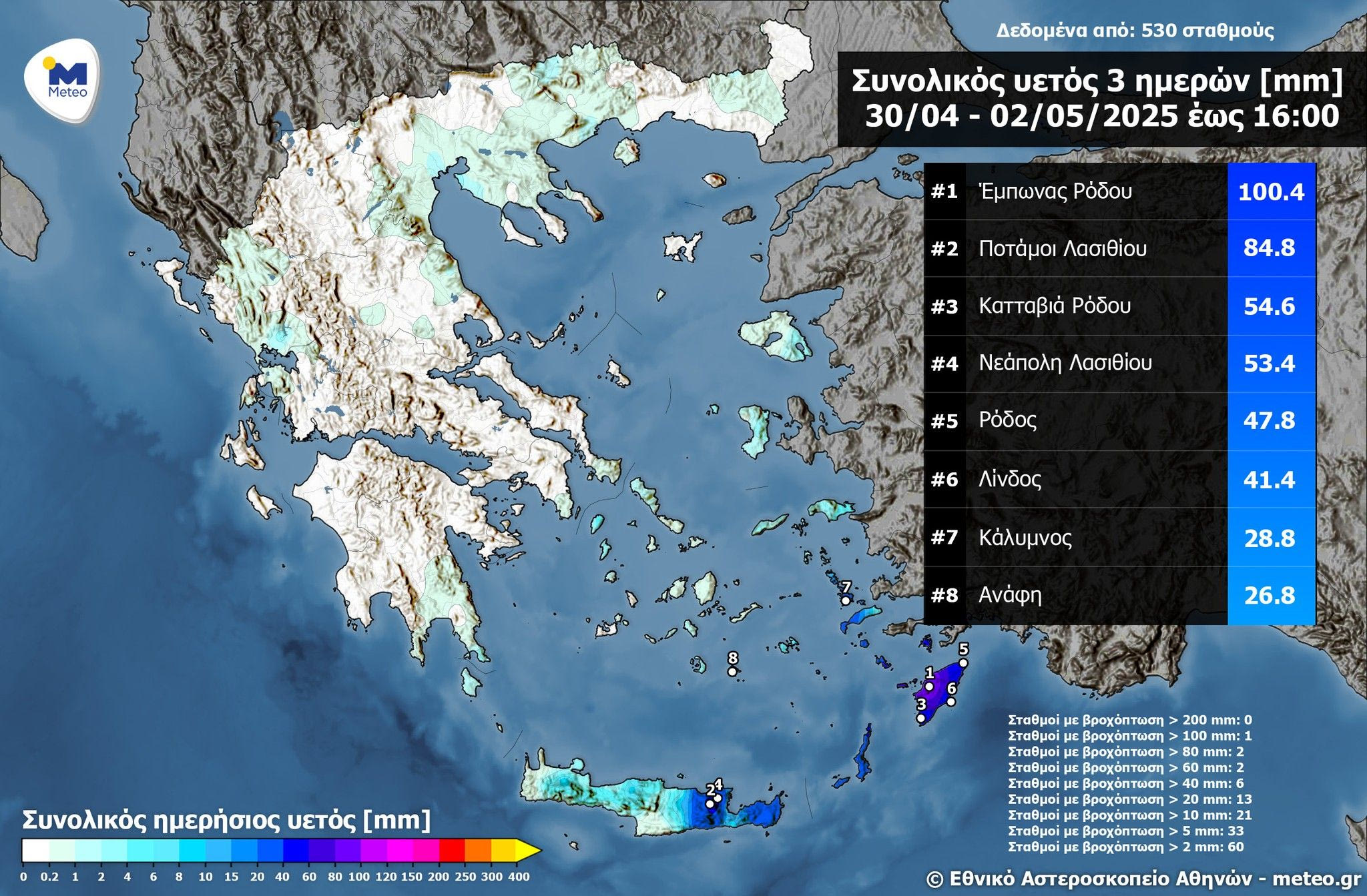 Σύμφωνα με το δίκτυο αυτόματων μετεωρολογικών σταθμών του Εθνικού Αστεροσκοπείου Αθηνών / meteo.gr, το ύψος βροχής στον Έμπωνα Ρόδου το τελευταίο τριήμερο έφτασε τα 100 mm (100,4 mm έως το μεσημέρι της Παρασκευής 02/05), ενώ στους Ποτάμους Λασιθίου ξεπέρασε τα 80 mm (84,8 mm έως το μεσημέρι της Παρασκευής 02/05).