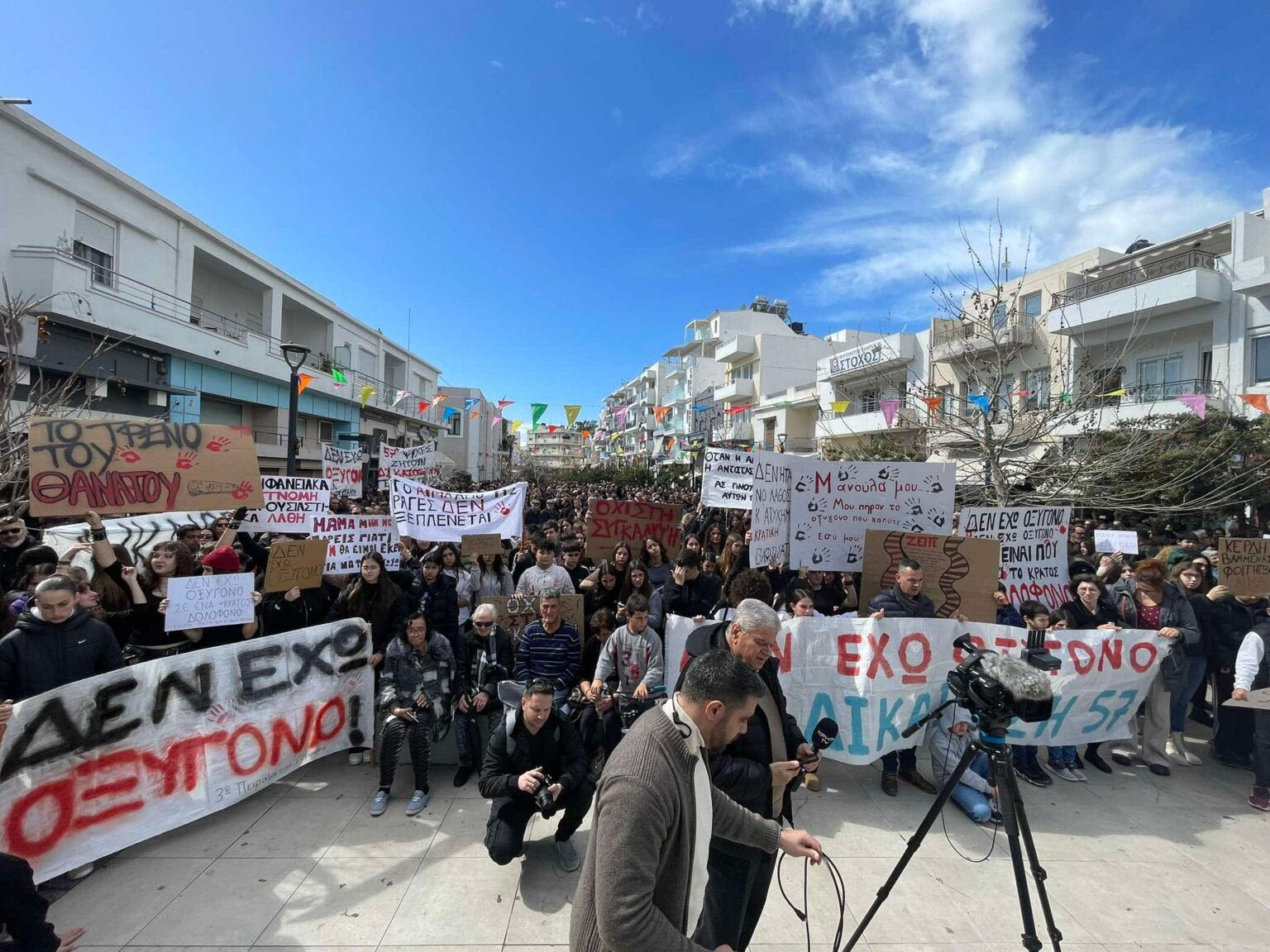 Μαθητές συλλογικότητες εργαζόμενοι πολίτες νέοι ηλικιωμένοι συμμετέχουν στο συλλαλητήριο ζητώντας όπως αναφέρουν τα συνθήματα στα πλακάτ «εδώ και τώρα απόδοση ευθυνών, δικαιοσύνη, δεν έχω οξυγόνο».
