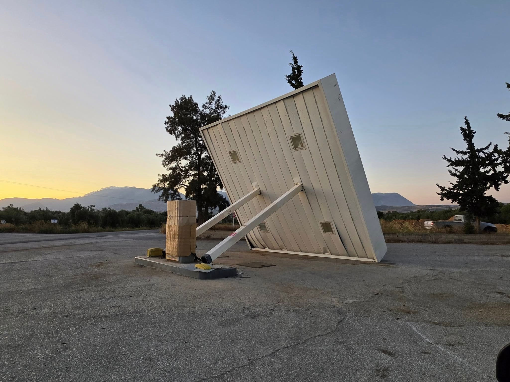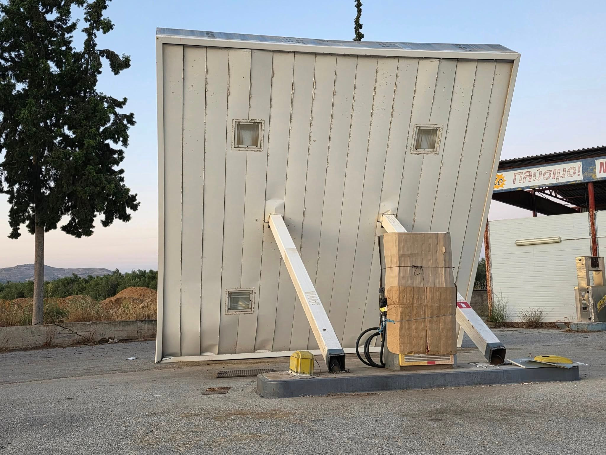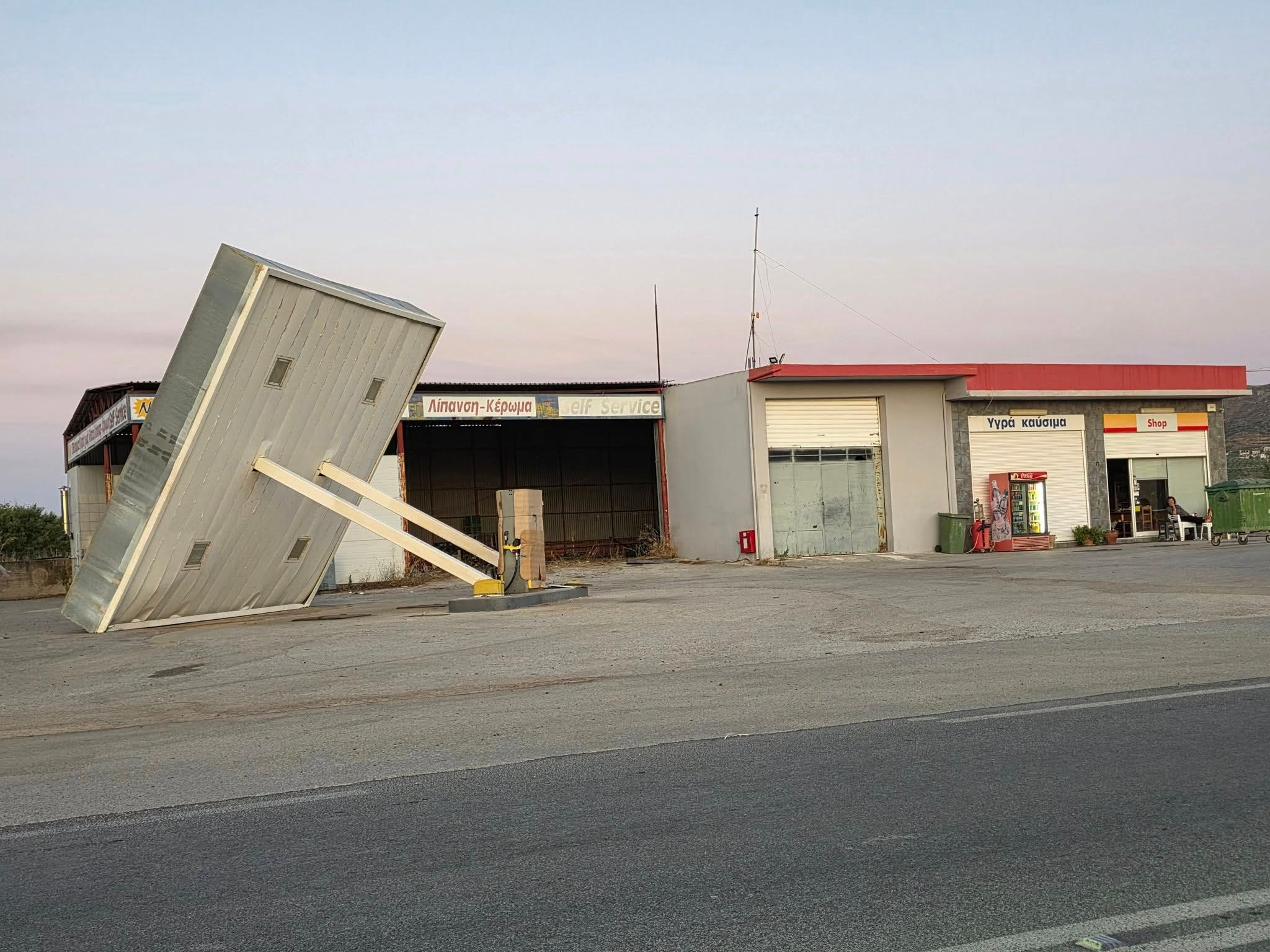 Οι δυνατοί άνεμοι που επικράτησαν σήμερα Κυριακή 29 Ιουνίου στον κάμπο της Μεσαράς κατάφεραν να… γκρεμίσουν μέχρι και το βαρύ, τεράστιο, στέγαστρο ενός Πρατηρίου Υγρών Καυσίμων έξω από τις Μοίρες, Δήμου Φαιστού.
