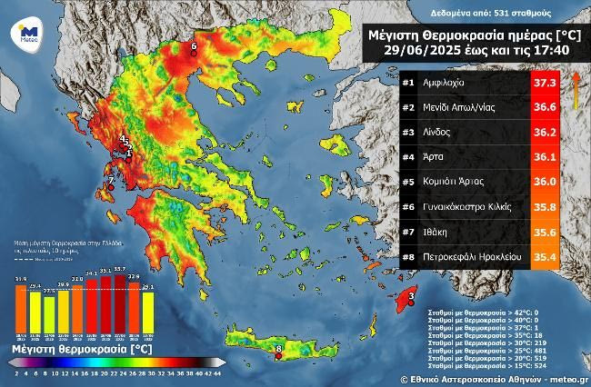 Η μέγιστη θερμοκρασία καταγράφηκε στην Αμφιλοχία (37.3 °C) και ακολούθησαν το Μενίδι Αιτωλοακαρνανίας (36.6 °C) και η Λίνδος (36.2 °C).