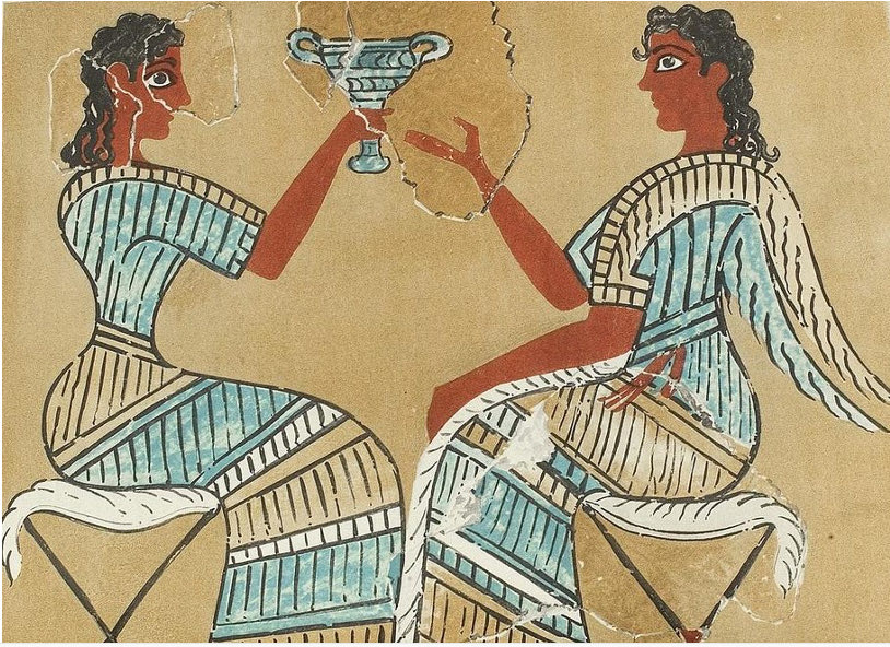 Τα σφηνοπότηρα από τα οποία τα πίνουμε μοιάζουν ύποπτα με ένα από τα πιο συνηθισμένα μας ευρήματα, τα κωνικά κύπελλα μαζικής παραγωγής, τα οποία οι Μινωίτες κατασκεύαζαν για γιορτές, όπως η δική μας.