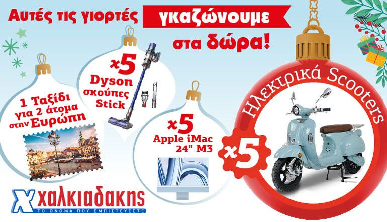 Ένα ταξίδι για δύο στην Ευρώπη, 5 ηλεκτρικά scooters, 5 Apple iMac 24” και 5 σκούπες Dyson Stick περιμένουν να κάνουν τα Χριστούγεννα σας ακόμα πιο μαγικά!