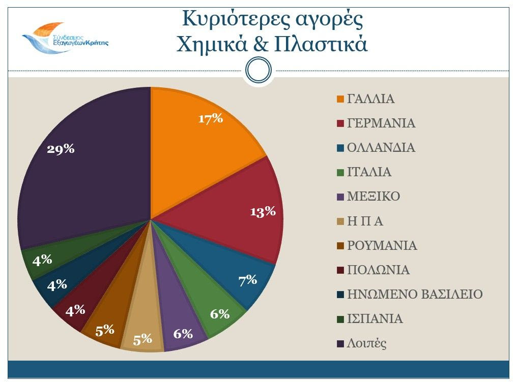 Για τον κλάδο των Χημικών & Πλαστικών, οι κυριότεροι αγοραστές είναι η Γαλλία με 8,3 εκ. ευρώ, η Γερμανία με 6,6 εκ. ευρώ, η Ολλανδία με 3,2 εκ. ευρώ, η Ιταλία με 2,8 εκ. ευρώ και το Μεξικό με 2,7 εκ. ευρώ.