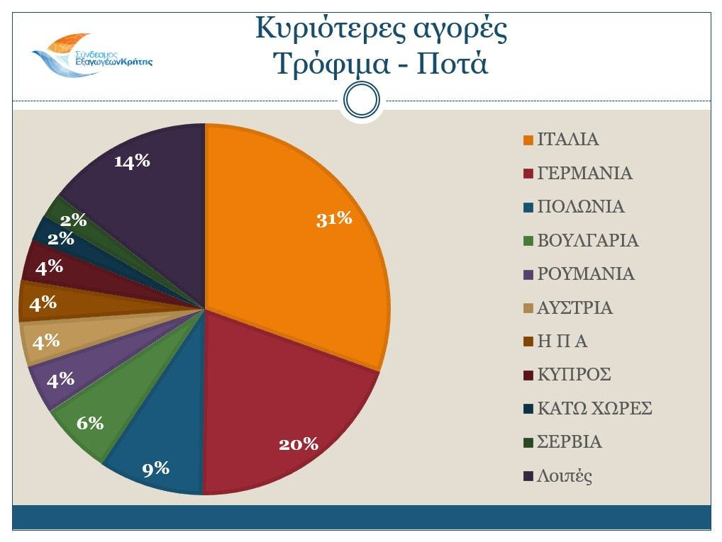 Σχετικά με τις αγορές, οι κυριότεροι αγοραστές των Κρητικών προϊόντων είναι η Ιταλία με τις εξαγωγές κατά το διάστημα Ιανουαρίου – Μαρτίου 2025 να φτάνουν τα 43 εκ. ευρώ, η Γερμανία με 34,7 εκ. ευρώ, η Γαλλία με 15,5 εκ. ευρώ, η Πολωνία με 15 εκ. ευρώ και η Βουλγαρία με 9,5 εκ. ευρώ. Τη δεκάδα των κυριότερων αγοραστών κλείνουν η Κύπρος, η Ρουμανία, η Ολλανδία, οι Η.Π.Α. και η Αυστρία.