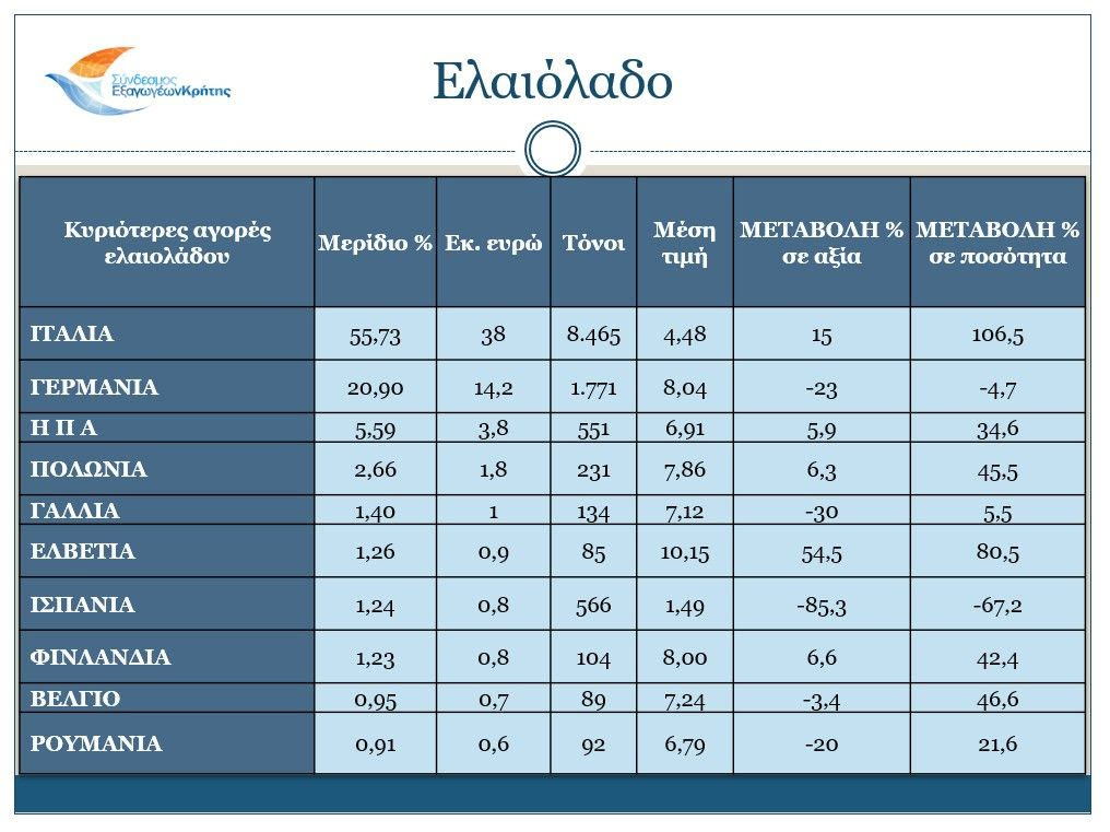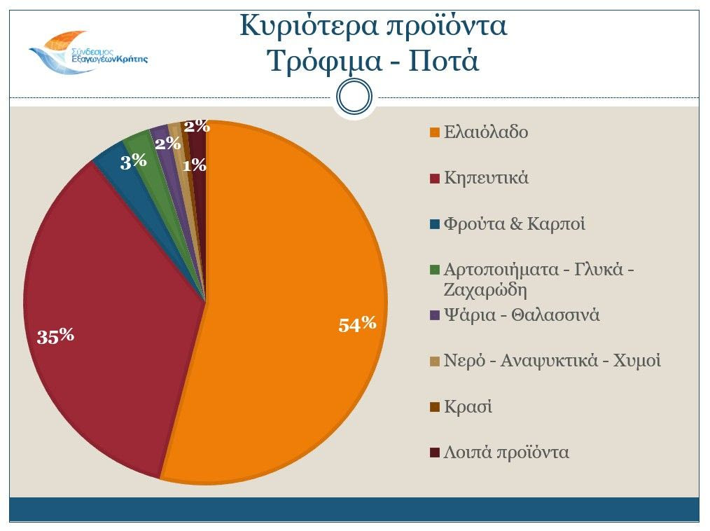 «Πρωτοστατεί και πάλι ο κλάδος των Τροφίμων & Ποτών και το ελαιόλαδο, του οποίου οι εξαγωγές μειώθηκαν μεν σε αξία, αλλά αυξήθηκαν σημαντικά σε ποσότητα. Κι αυτό γιατί η τιμή του ελαιολάδου επιστρέφει σε πιο κανονικά επίπεδα, αν και παραμένει αυξημένη σε σχέση με προηγούμενες χρονιές. Οι επόμενοι μήνες και οι επιδόσεις των Κρητικών εξαγωγών αναμένονται με ιδιαίτερο ενδιαφέρον».