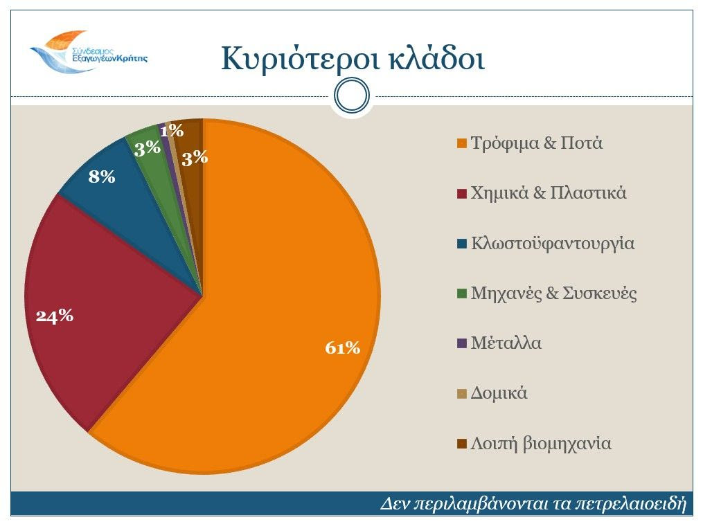 Ο κλάδος των Τροφίμων και Ποτών, ο οποίος αποτελεί το 61,2% του συνόλου των Κρητικών εξαγωγών κατά το εξεταζόμενο διάστημα με 125,9 εκ. ευρώ, παρουσιάζει μικρή μείωση ίση με 0,7% σε αξία και αύξηση 12% σε ποσότητα. Ο κλάδος των Χημικών & Πλαστικών έρχεται δεύτερος, με μερίδιο περίπου 23,7% επί του συνόλου των εξαγωγών της Κρήτης και αύξηση της τάξεως του 8% σε αξία και 13,2% σε ποσότητα. Ακολουθούν οι κλάδοι της Κλωστοϋφαντουργίας (μερίδιο 7,9% και μείωση 6,3%) των Μηχανών & Συσκευών (μερίδιο 3,2% και αύξηση 8,3%), και με μικρότερα μερίδια τα Μέταλλα & κατασκευές, τα Δομικά Υλικά, η Λαϊκή Τέχνη και τα λοιπά βιομηχανικά προϊόντα.