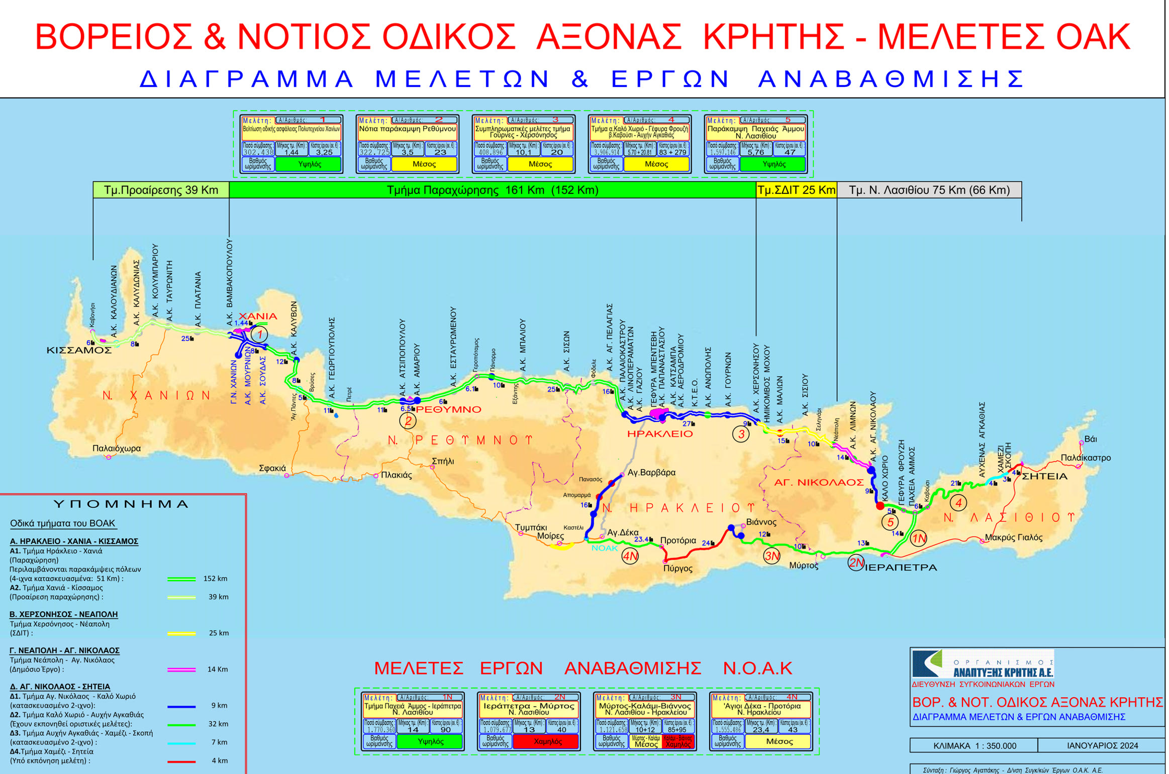 «Λοιπές μελέτες ολοκλήρωσης του οδικού άξονα Αγ. Βαρβάρα – Αγ. Δέκα – Βιάννος – Ιεράπετρα – Παχειά Άμμος, Τμήμα : Προτορια – Αγ .Δέκα» (Ενάριθμο έργου : 2023ΝΑ47100135) έχουν εγκριθεί τόσο οι περιβαλλοντικοί όροι για το υποτμήμα «Προτόρια – Στόλοι» (ΑΕΠΟ αρ. πρωτ. οικ. 2394/1-7-16 Α.Δ.Κ./ΑΔΑ:62ΡΛΟΡ1Θ-ΜΒΧ) όσο και για το υποτμήμα «Στόλοι – Αγ. Δέκα» (ΑΕΠΟ αριθμ. πρωτ 227π.ε./21-12-18 Α.Δ.Κ./ ΑΔΑ:ΨΩΛΙΟΡ1Θ-2ΛΓ). Όσον αφορά το υποτμήμα «Προτόρια – Στόλοι» έχει εγκριθεί η οριστική μελέτη οδοποιίας αρτηρίας, παράλληλου δικτύου και ισόπεδων κόμβων (αρ. πρωτ. 293036/22-09-2022 Γ.Δ.Σ.Υ.) ενώ για το υποτμήμα «Στόλοι – Αγ. Δέκα» με το υπ. αριθμ. 58/04-01-2024 έγγραφο μας έχει διαβιβαστεί η οριστική μελέτη οδικών έργων στο Υ.ΥΠΟ.ΜΕ./ΓΓΥ/Δ.Ο.Υ. προς έγκριση.