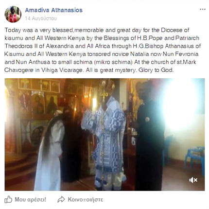 Η σελίδα «ORTHODOX CHURCH DIOCESE OF KISUMU AND WESTERN KENYA» στο facebook προανήγγειλε το γεγονός της χειροτονίας της Ναταλίας Λιονάκη σε «αδελφή Φεβρωνία» με μεγάλη χαρά.