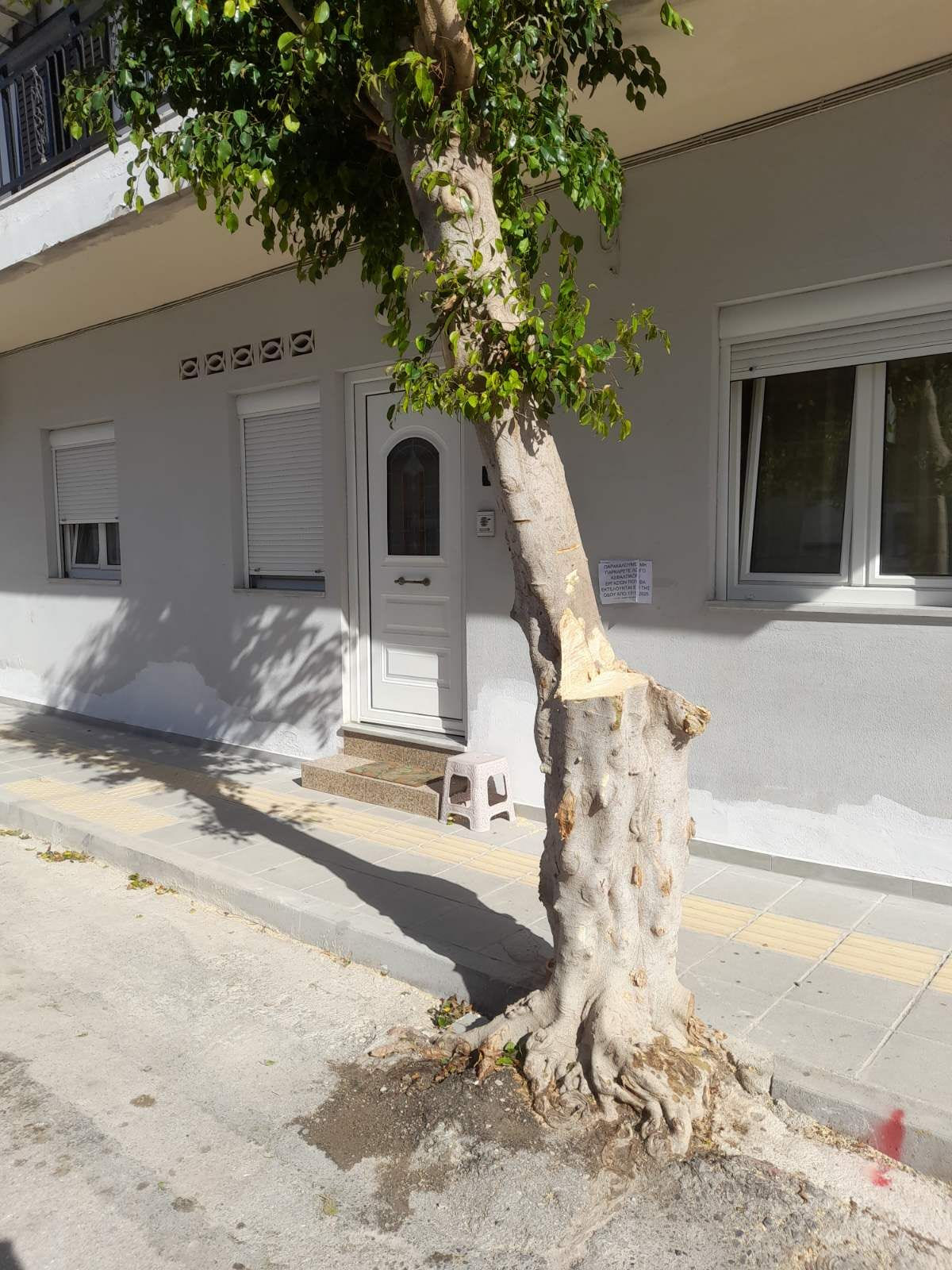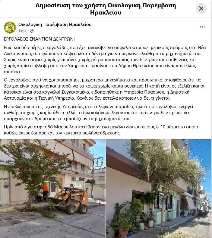 «Εδώ και δύο μέρες ο εργολάβος που έχει αναλάβει να ασφαλτοστρώσει μερικούς δρόμους στη Νέα Αλικαρνασσό, αποφάσισε να κόψει όλα τα δέντρα για να περνάνε ελεύθερα τα μηχανήματά του. Χωρίς καμία άδεια, χωρίς γεωπόνο, χωρίς μέτρα προστασίας των δέντρων από ασθένειες και χωρίς καμία επίβλεψη από την Υπηρεσία Πρασίνου του Δήμου Ηρακλείου που είναι παντελώς απούσα.