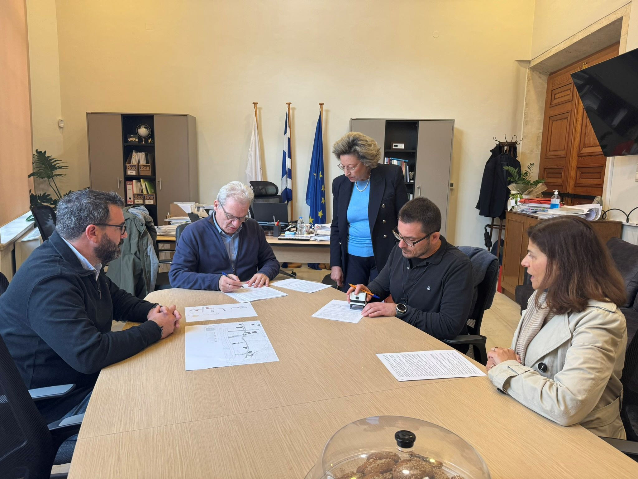 Τη σύμβαση του έργου ανάπλασης της οδού Δελημάρκου και κάθετων οδών της στην Αγία Τριάδα, υπέγραψε ο Δήμαρχος Ηρακλείου Αλέξης Καλοκαιρινός με τον εκπρόσωπο της αναδόχου εταιρίας, παρουσία του Αντιδημάρχου Τεχνικών Έργων Γιώργου Σισαμάκη, της Γενικής Γραμματέως του Δήμου Μαρίας Σκραφνάκη και της Προϊσταμένης του Τμήματος Παλιάς Πόλης & Ενετικών Τειχών της Τεχνικής Υπηρεσίας Εύης Παπαδάκη.