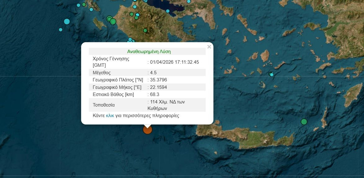 Το επίκεντρό του ήταν 114 χλμ. νοτιοδυτικά των Κυθήρων ενώ το εστιακό του βάθος του ήταν 68,3 χιλιόμετρα.
