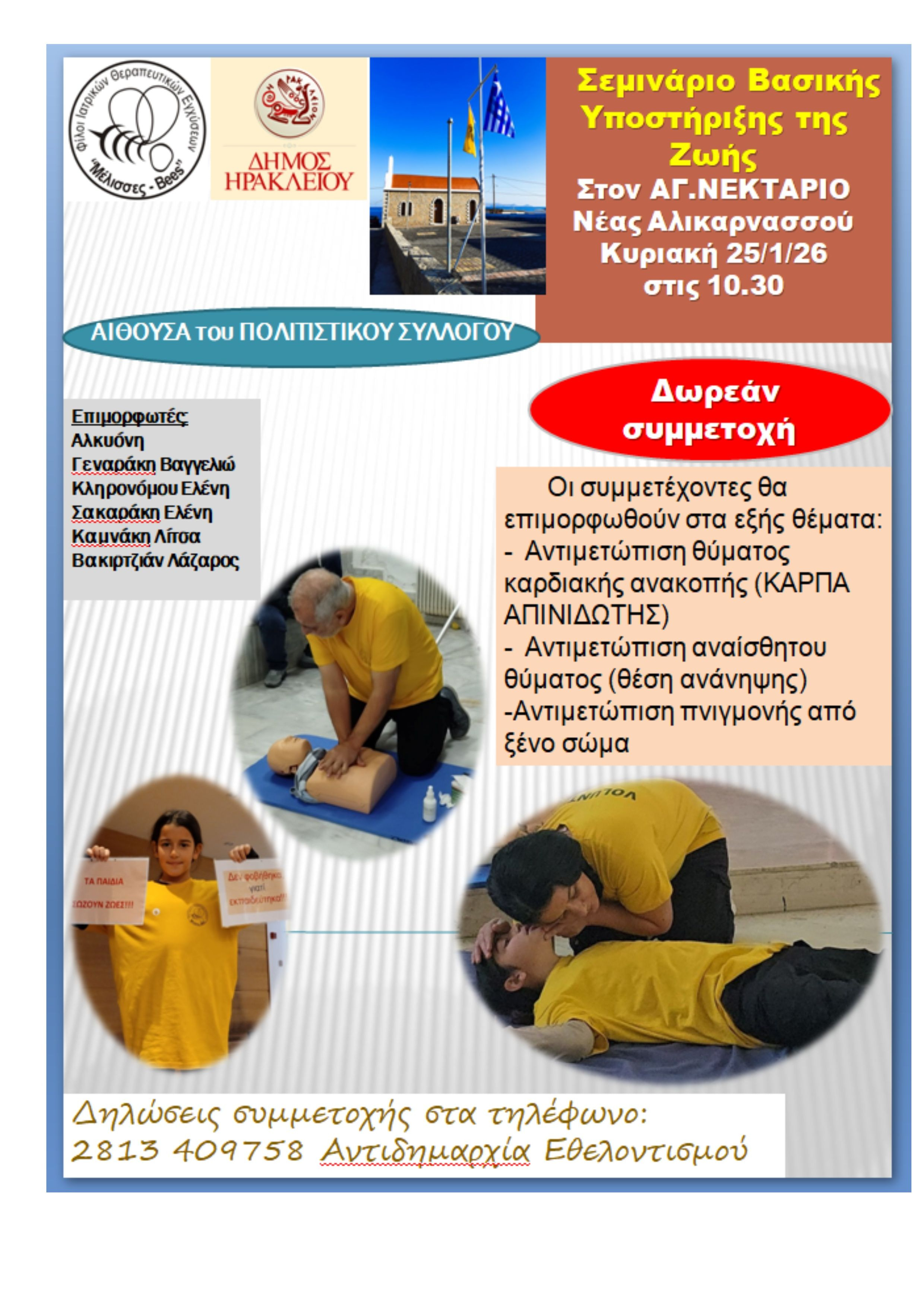 Σεμινάριο Βασικής Υποστήριξης της Ζωής με ελεύθερη συμμετοχή διοργανώνουν η Αντιδημαρχία Εθελοντισμού του Δήμου Ηρακλείου και οι «Φίλοι Ιατρικών Θεραπευτικών Εντόμων – Μέλισσες» την Κυριακή 25 Ιανουαρίου 2026 στις 10:30 στον Άγιο Νεκτάριο Νέας Αλικαρνασσού.