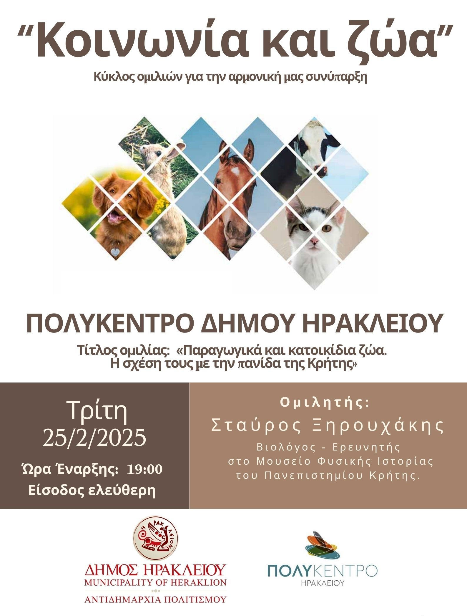 Η πρώτη ομιλία με τίτλο «Παραγωγικά και κατοικίδια ζώα. Η σχέση τους με την πανίδα της Κρήτης» θα πραγματοποιηθεί την Τρίτη 25 Φεβρουαρίου στις 19.00, στο Πολύκεντρο του Δήμου Ηρακλείου, με ομιλητή τον Βιολόγο- Ερευνητή του Μουσείου Φυσικής Ιστορίας του Πανεπιστημίου Κρήτης Σταύρο Ξηρουχάκη.