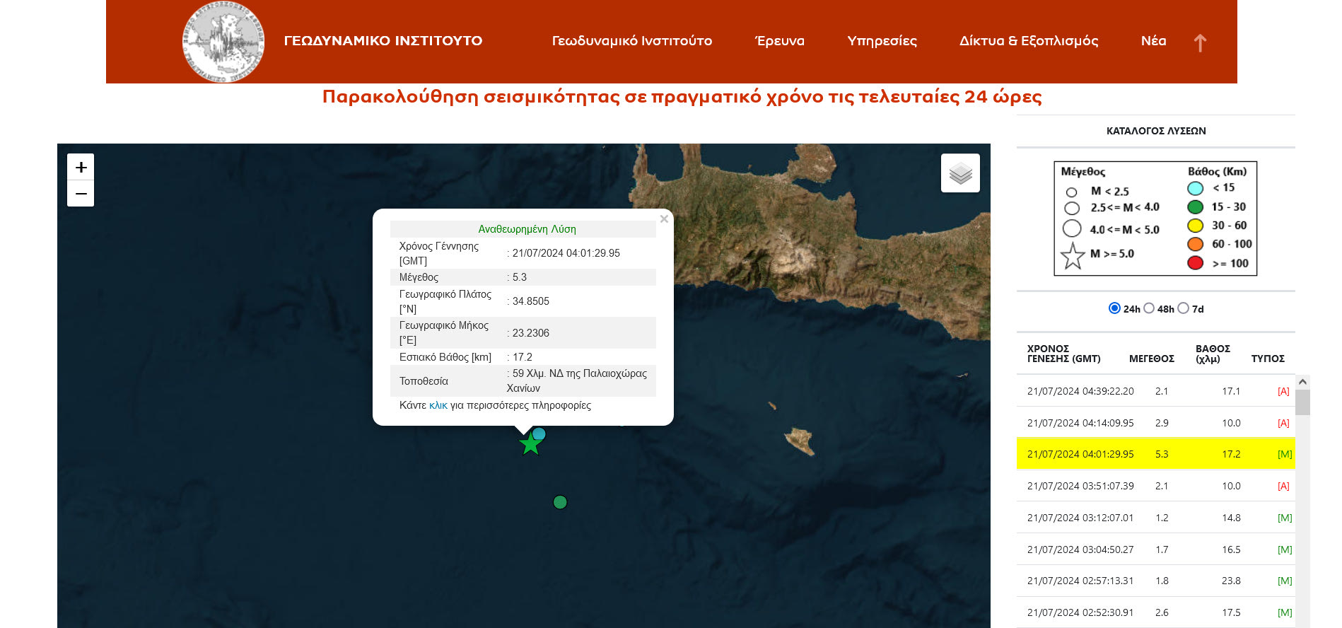 Νέα σεισμική δόνηση 5,3 βαθμών της κλίμακας ρίχτερ σημειώθηκε ένα λεπτό μετά τις 7 το πρωί σήμερα νοτιοδυτικά της Κρήτης.