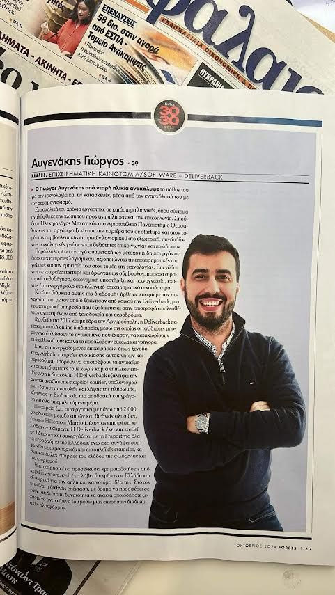 Ο λόγος για τον Γιώργο Αυγενάκη που κατάφερε όχι μόνο να δημιουργήσει την Deliverback, αλλά να μπει στην επίλεκτη λίστα Forbes για τους με τους πιο επιτυχημένους νέους κάτω των 30. «Η είσοδός μου στη λίστα Forbes 30 under 30 -τονίζει ο ίδιος μιλώντας στην «Π»-είναι μια τεράστια τιμή και αναγνώριση της δουλειάς που έχει γίνει τόσο από εμένα όσο και από την ομάδα της Deliverback.