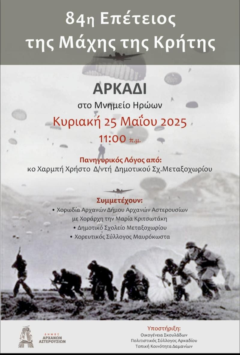 Την Κυριακή 25 Μαΐου ολοκληρώνονται οι εκδηλώσεις τιμής στο Αρκάδι στις 11π.μ στο μνημείο Ηρώων.