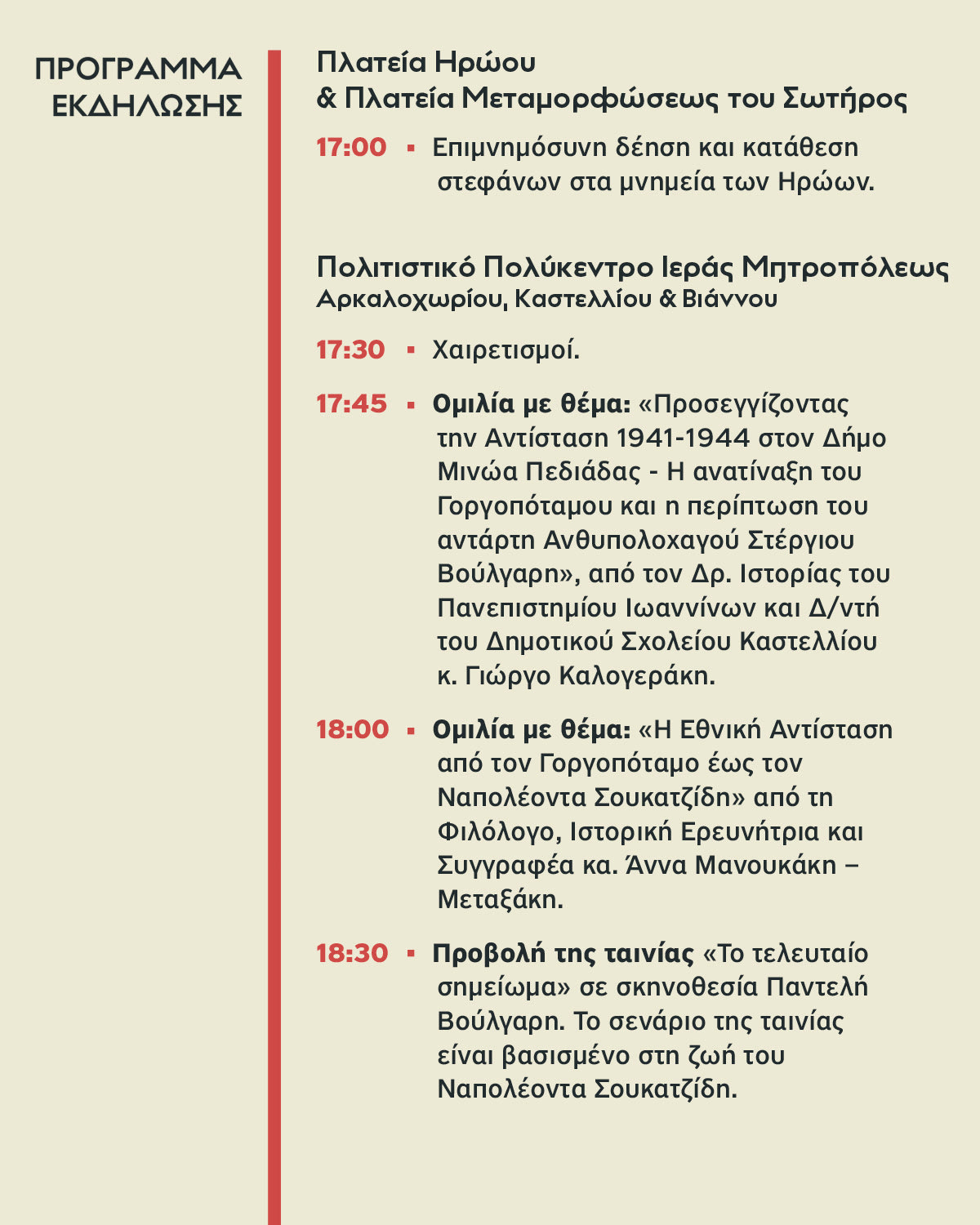 17:45: Ομιλία με θέμα: «Προσεγγίζοντας την Αντίσταση 1941-1944 στον Δήμο Μινώα Πεδιάδας – Η ανατίναξη του Γοργοπόταμου και η περίπτωση του αντάρτη Ανθυπολοχαγού Στέργιου Βούλγαρη», από τον Δρ. Ιστορίας του Πανεπιστημίου Ιωαννίνων και Δ/ντή του Δημοτικού Σχολείου Καστελλίου κ. Γιώργο Καλογεράκη.