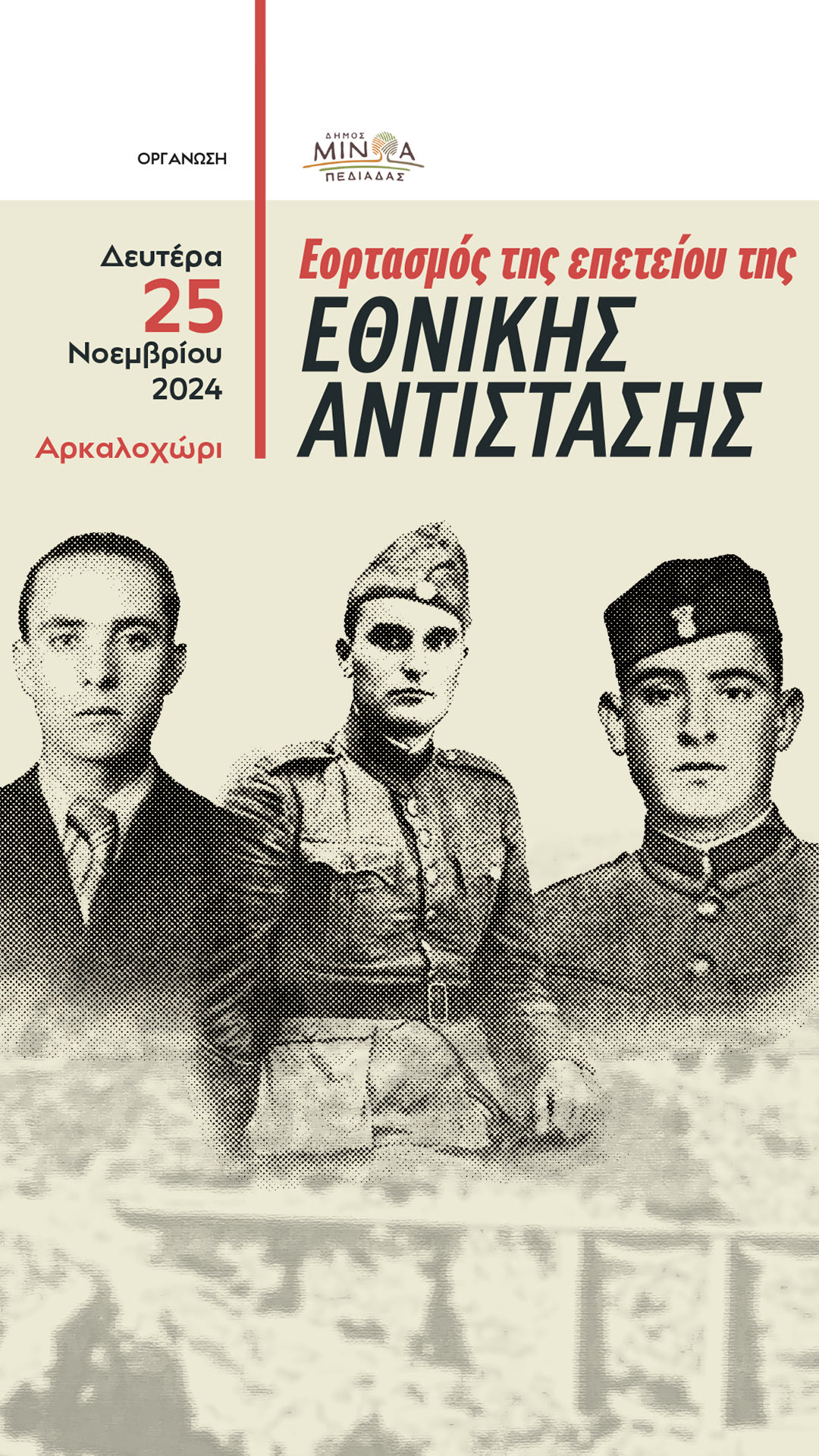 Ο Δήμος Μινωα Πεδιάδας τιμάει την Επέτειο της Εθνικής Αντίστασης με μία σημαντική εκδήλωση που θα πραγματοποιηθεί στο Πολιτιστικό Πολύκεντρο Ιεράς Μητροπόλεως Αρκαλοχωρίου, Καστελλίου και Βιάννου στο Αρκαλοχώρι, τη Δευτέρα 25 Νοεμβρίου.