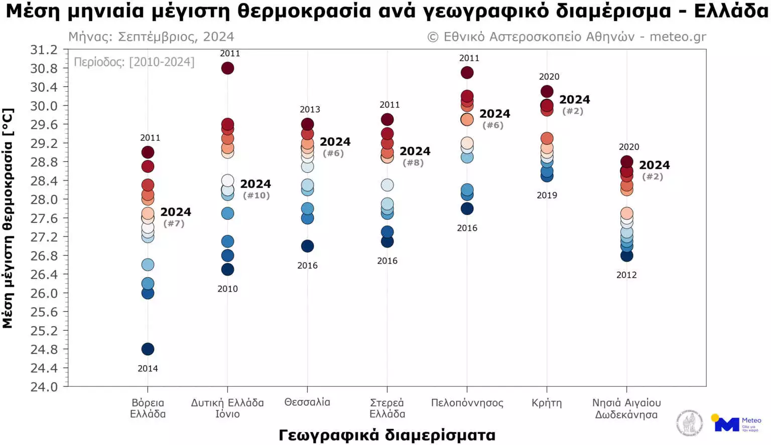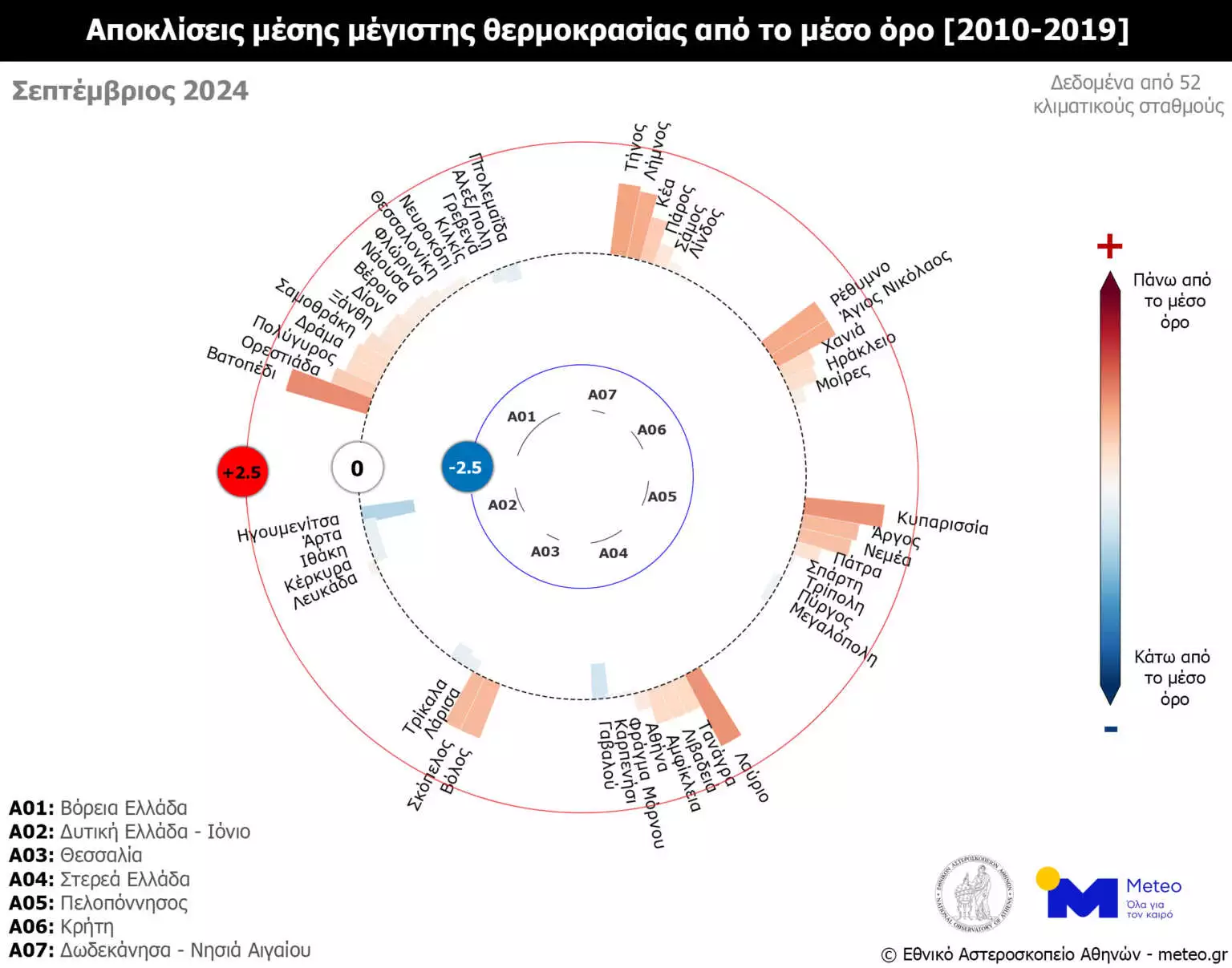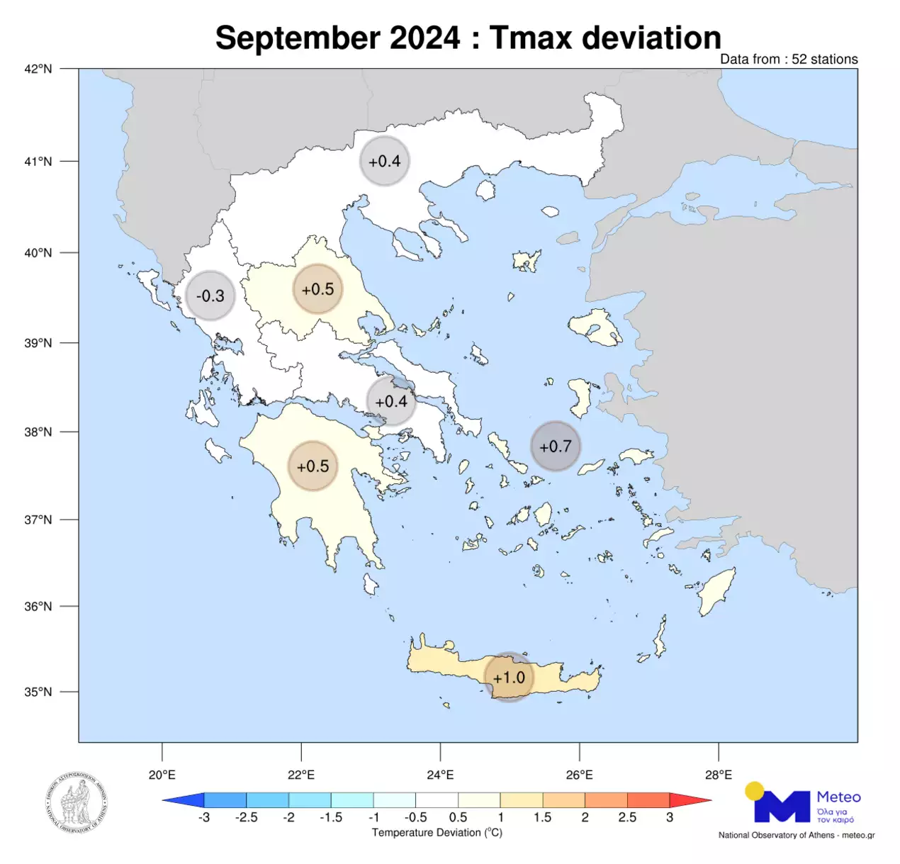 Σύμφωνα με το δίκτυο των 53 μετεωρολογικών σταθμών του meteo.gr του Εθνικού Αστεροσκοπείου που λειτουργούν ανελλιπώς από το 2010 μέχρι σήμερα, τον φετινό Σεπτέμβριο η μέση τιμή των μεγίστων ημερήσιων θερμοκρασιών κυμάνθηκε σε κανονικά για την εποχή επίπεδα στις περισσότερες περιοχές της χώρας εκτός της Κρήτης και των νησιών του Αιγαίου.
