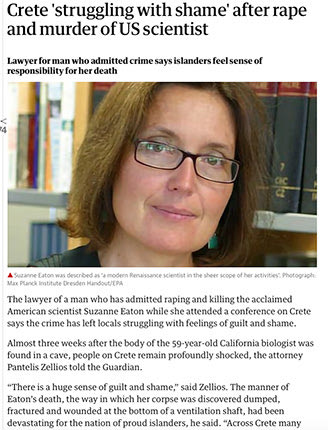 Εντύπωση προκαλεί ο τίτλος στο εκτενές δημοσίευμα της εφημερίδας Guardian αναφορικά με την άγρια δολοφονία της αδικοχαμένης Σούζαν Ίτον στα Χανιά. Όπως διαπιστώνεται από τους αναγνώστες, ο «περίεργος» τίτλος δεν σχετίζεται με τις δηλώσεις που έκανε ο δικηγόρος του δολοφόνου της Ίτον ως προς το “βάρος” που πέφτει (ή δεν πέφτει) στο νησί όπου διαπράχθηκε το έγκλημα.