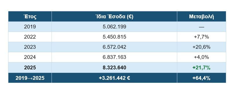 Τα ίδια έσοδα αυξήθηκαν από 5,06 εκατ. ευρώ το 2019 σε 8,32 εκατ. ευρώ το 2025 — αύξηση +3,26 εκατ. ευρώ (+64,4%) σε έξι χρόνια.