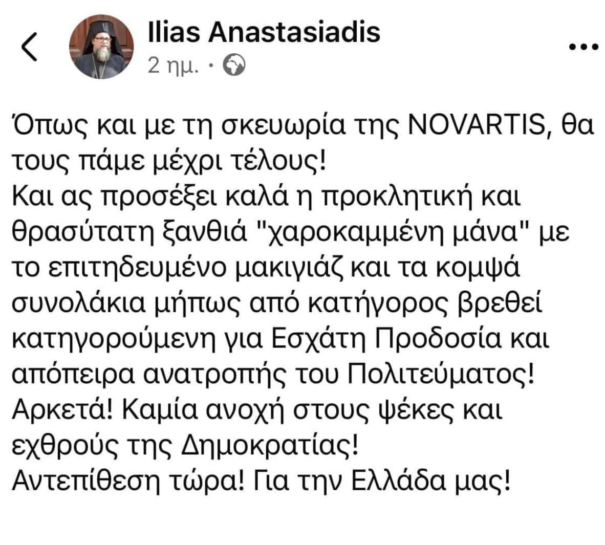Ο Μητροπολίτης Ρεθύμνης και Αυλοποτάμου Πρόδρομος και το σύνολο των κληρικών της Ιεράς Μητροπόλεως αποδοκίμασαν τις αναρτήσεις του Αρχιμανδρίτη Ρωμανού Αναστασιάδη, ο οποίος καταφέρθηκε κατά της πρόεδρου συλλόγου οικογενειών θυμάτων Τεμπών, Μαρίας Καρυστιανού προειδοποιώντας μάλιστα την «προκλητική και θρασύτατη ξανθιά “χαροκαμμένη μάνα” με το επιτηδευμένο μακιγιάζ και τα κομψά συνολάκια μήπως από κατήγορος βρεθεί κατηγορούμενη για Εσχάτη Προδοσία και απόπειρα ανατροπής του Πολιτεύματος!». Στη συνέχεια, με νέα ανάρτηση του ζήτησε συγγνώμη