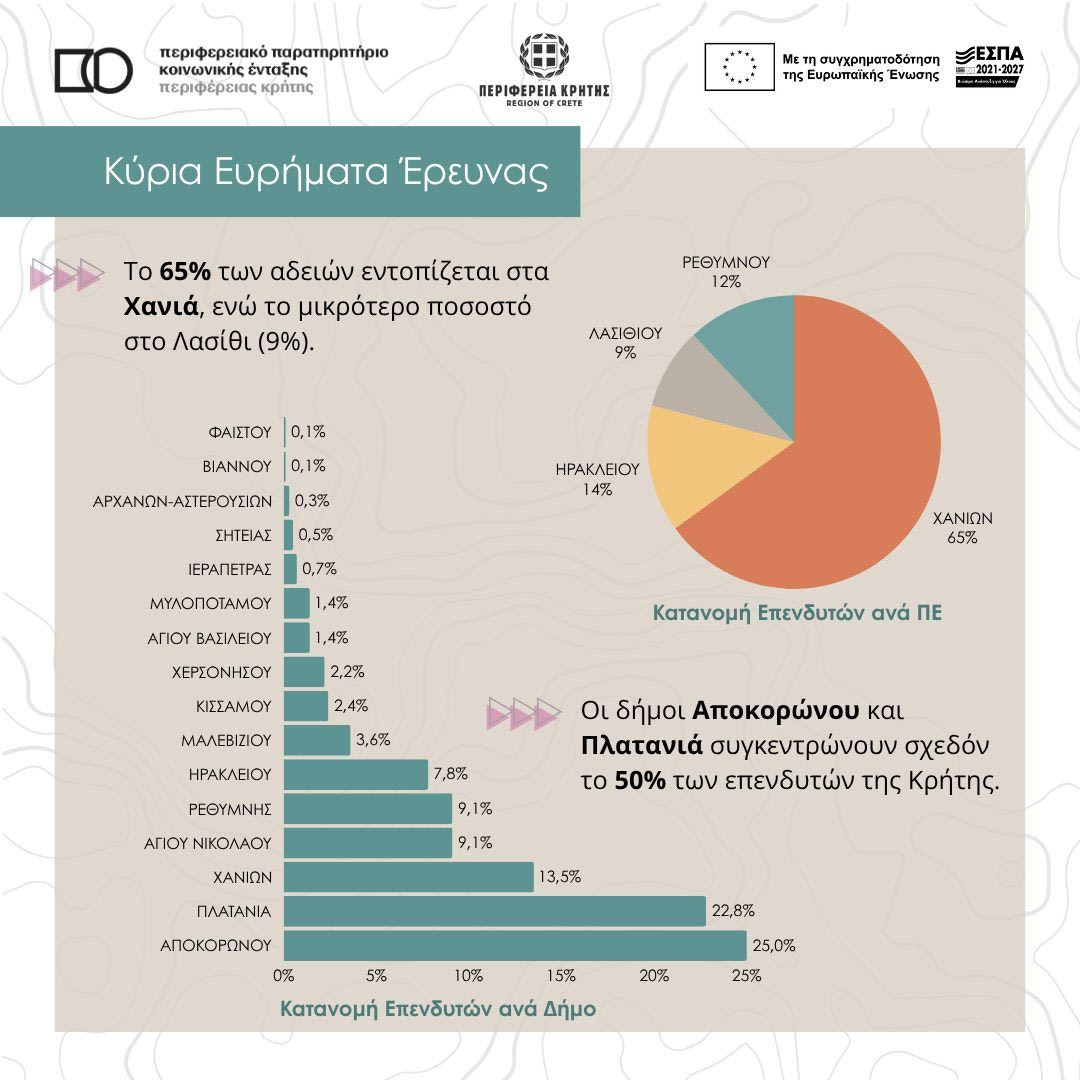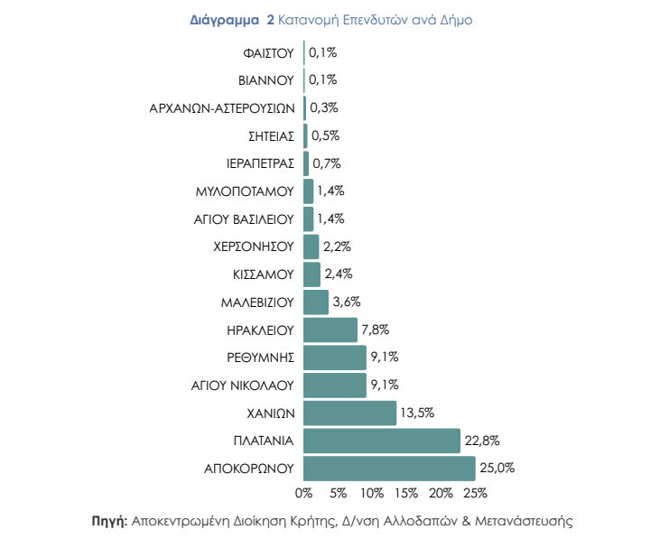 Το 65% των επενδυτών έχει επιλέξει τα Χανιά, με τους Δήμους Αποκορώνου και Πλατανιά να συγκεντρώνουν τους περισσότερους.
