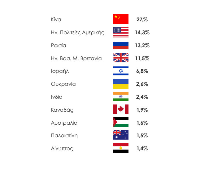 Ακολουθούν οι Ηνωμένες Πολιτείες (14,3%), η Ρωσία (13,2%) και το Ηνωμένο Βασίλειο (11,5%), ενώ σημαντική είναι η παρουσία επενδυτών από το Ισραήλ (6,8%). Πέρα από τις χώρες που απεικονίζονται στο γράφημα, οι επενδυτές από τις υπόλοιπες χώρες καλύπτουν το 14,1% των αδειών.