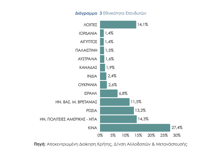 Οι επενδυτές στην Περιφέρεια Κρήτης προέρχονται συνολικά από 48 διαφορετικές χώρες, όμως οι άδειες μόνιμου επενδυτή συγκεντρώνονται σε έναν περιορισμένο αριθμό χωρών, με κυρίαρχη την Κίνα (27,4%).