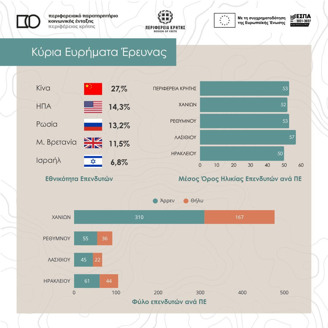 Συνολικά, τα στοιχεία δείχνουν μια άνισα κατανεμημένη και ποικιλόμορφη κοινότητα επενδυτών στην Κρήτη. Γενικότερα, η Περιφέρεια Κρήτης προσελκύει κυρίως άνδρες επενδυτές με μέσο όρο ηλικίας 53 ετών, αν και παρατηρούνται διαφοροποιήσεις ανά δήμο και περιφερειακή ενότητα.