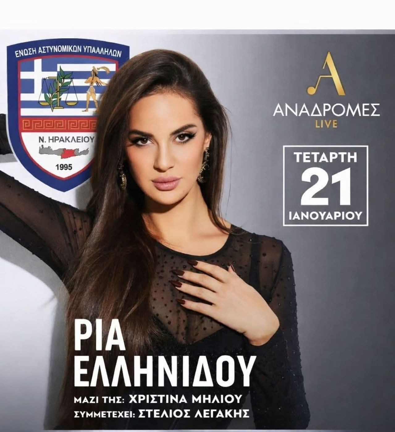 Η Ένωσή Αστυνομικών Υπαλλήλων ν.Ηρακλείου θα πραγματοποιήσει την ετήσια εκδήλωσή της, την 21-01-2026 και ώρα 22.00 στο κέντρο διασκέδασης ‘’ Αναδρομές’’ στις Αρχάνες Ηρακλείου όπου θα τραγουδήσει η Ρία Ελληνίδου με τους συνεργάτες της.
