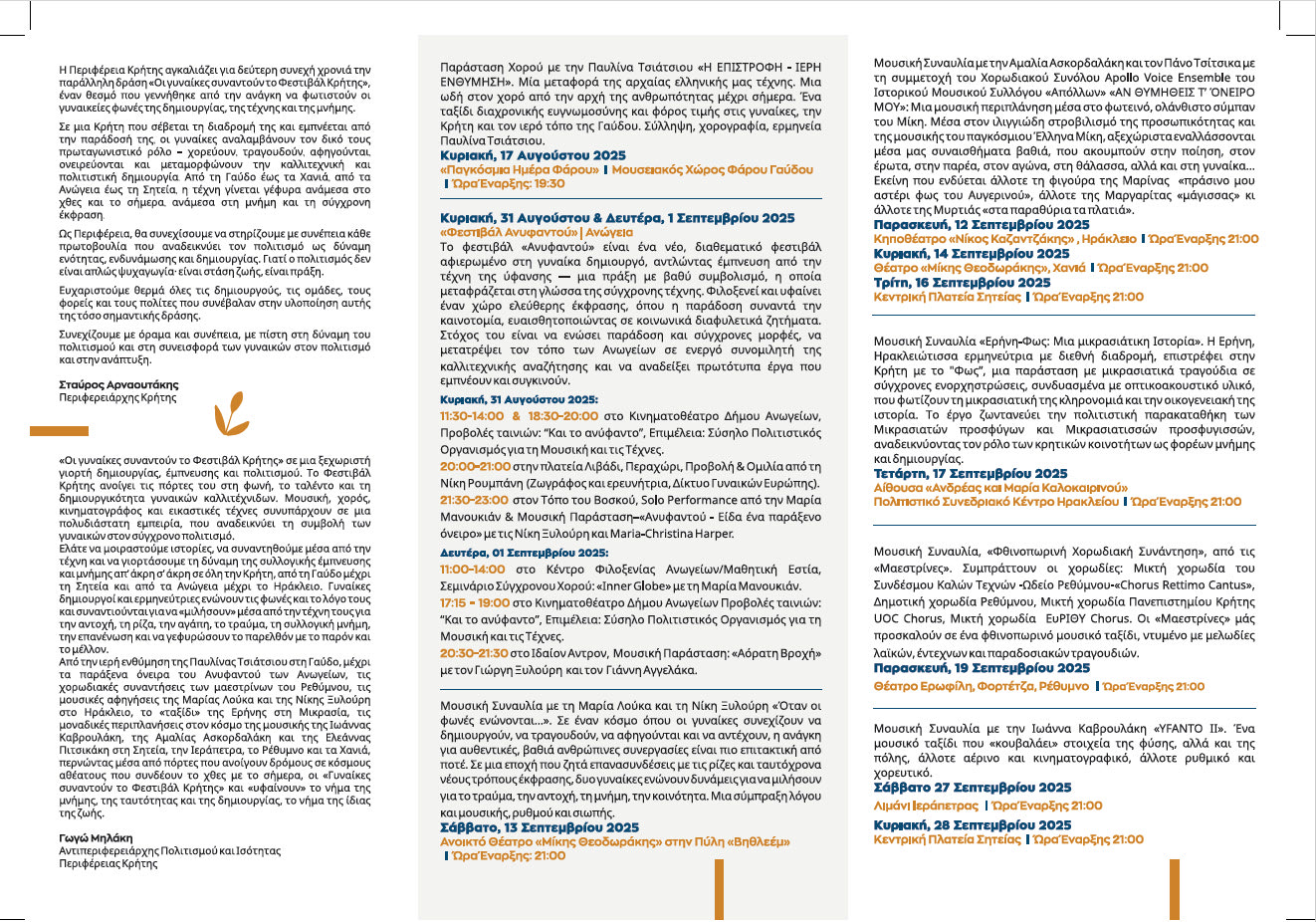 1.Κυριακή, 17 Αυγούστου 2025, «Παγκόσμια Ημέρα Φάρου» | Μουσειακός Χώρος Φάρου Γαύδου | Παράσταση Χορού με την Παυλίνα Τσιάτσιου «Η ΕΠΙΣΤΡΟΦΗ – ΙΕΡΗ ΕΝΘΥΜΗΣΗ». Μία μεταφορά της αρχαίας ελληνικής μας τέχνης. Μια ωδή στον χορό από την αρχή της ανθρωπότητας μέχρι σήμερα. Ένα ταξίδι διαχρονικής ευγνωμοσύνης και φόρος τιμής στις γυναίκες, την Κρήτη και τον ιερό τόπο της Γαύδου. Σύλληψη, χορογραφία, ερμηνεία Παυλίνα Τσιάτσιου. Ώρα Έναρξης: 19:30.