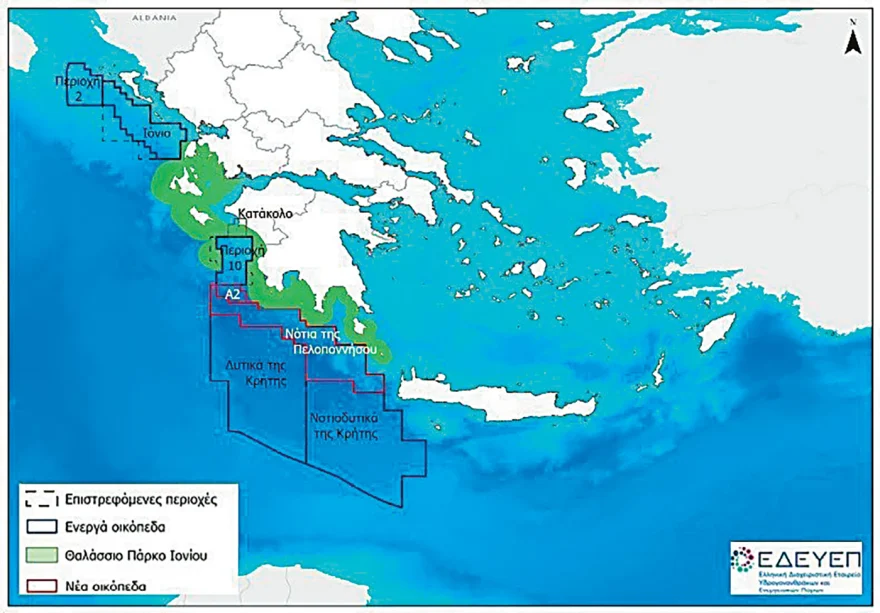 Την ίδια ώρα, η κυβέρνηση χορηγεί ένα δεύτερο μικρότερο μπλοκ στη βόρεια πλευρά του στόχου της Chevron (το Α2) στην HelleniQ Energy. Η τελευταία, η οποία αποτελεί τη συνέχεια της Δημόσιας Επιχείρησης Πετρελαίου (ΔΕΠ) διεκδικώντας έναν πιο ουσιαστικό πλέον ρόλο στον τομέα του upstream, βρίσκεται δίπλα στη μεγάλη αμερικανική εταιρεία στα νότια της Πελοποννήσου. Το οικόπεδο Α2, που φιγουράρει στον χάρτη ο οποίος περιλαμβάνει την περιοχή νοτιοδυτικά της Πελοποννήσου έως τα δυτικά της Κρήτης, δόθηκε ως αντάλλαγμα στα πρώην ΕΛ.ΠΕ. για την παραχώρηση τμημάτων από έκταση που τους έχει παραχωρηθεί και επιστρέφεται για περιβαλλοντικούς όρους (Εθνικό Θαλάσσιο Πάρκο).