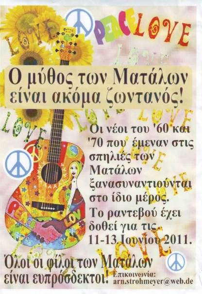 Ωστόσο στις 4, 5 και 6 Ιουλίου εκεί όπου οι χίπις από όλο τον πλανήτη έγραψαν τη δική τους ξεχωριστή ιστορία θα πραγματοποιηθεί το 12ο Matala beach festival, σε φιλοσοφία και ατμόσφαιρα πολύ διαφορετική από αυτήν του πρώτου που έγινε τον Ιούνιο του 2011.