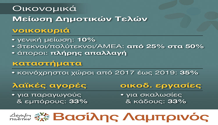 - Μείωση των Τελών στις Λαϊκές Αγορές: Από 6€/ημέρα σε 4€/ημέρα για την παρουσία των παραγωγών στη λαϊκή. Από 12 €/ημέρα σε 8€/ημέρα οι έμποροι., αλλά και σε άλλες κατηγορίες, όπως στα Τέλη Κοιμητηρίων, όπου θεσμοθετήθηκε και καθεστώς άτοκων δόσεων.