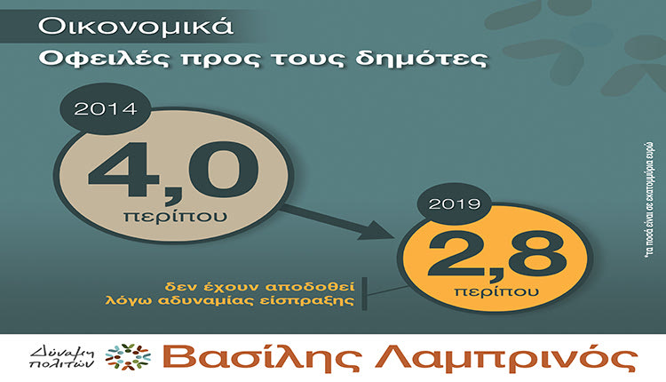 - Συνέπεια στις ̟πληρωμές – επιστροφές ̟προς τους δημότες. Τον Δεκέμβριο 2018 οι απλήρωτες υποχρεώσεις του δήμου έναντι των δημοτών ήταν 2.826.000,00 € σε σχέση με τα 4.000.000,00 €. που παραλάβαμε.