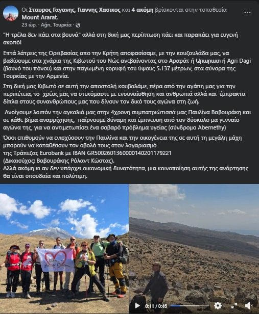 Με το σύνθημα «Η τρέλα δεν πάει στα βουνά — αλλά εμείς την πάμε για καλό σκοπό», επτά λάτρεις της ορειβασίας από την Κρήτη ετοιμάζονται να κατακτήσουν την παγωμένη κορυφή του μυθικού όρους Αραράτ, στα σύνορα Τουρκίας και Αρμενίας, σε υψόμετρο 5.137 μέτρων.