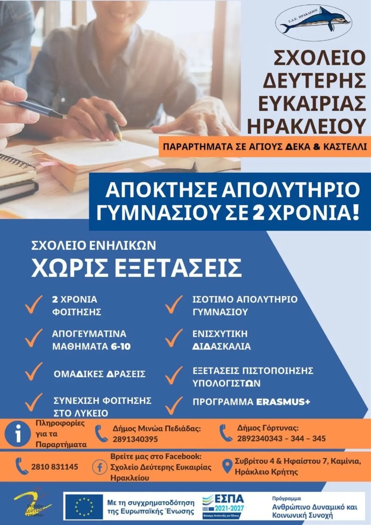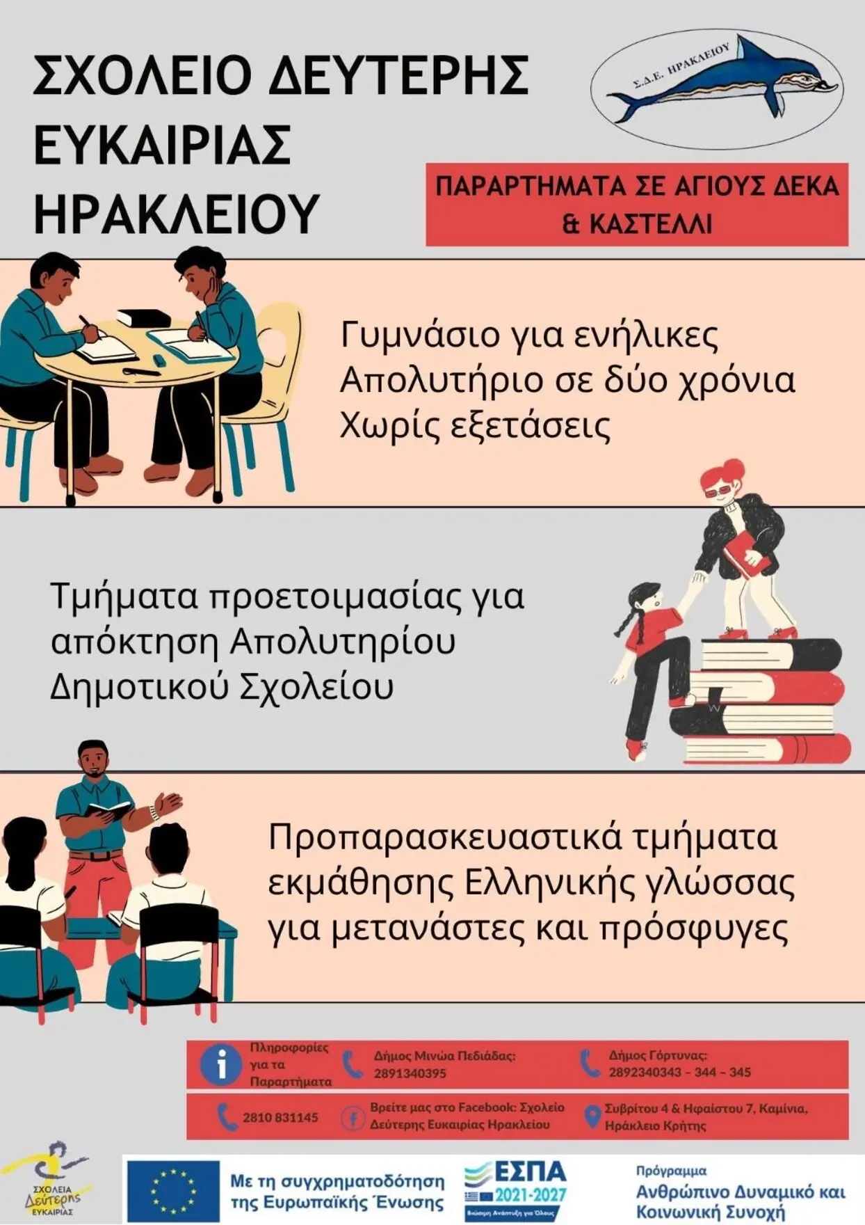 Συνεχίζονται, έως και τις 30 Σεπτεμβρίου 2025 οι εγγραφές στο Σχολείο Δεύτερης Ευκαιρίας (ΣΔΕ), στους Αγίους Δέκα, που απευθύνεται σε ενήλικες οι οποίοι επιθυμούν να ολοκληρώσουν την υποχρεωτική εκπαίδευση και να αποκτήσουν απολυτήριο Γυμνασίου.