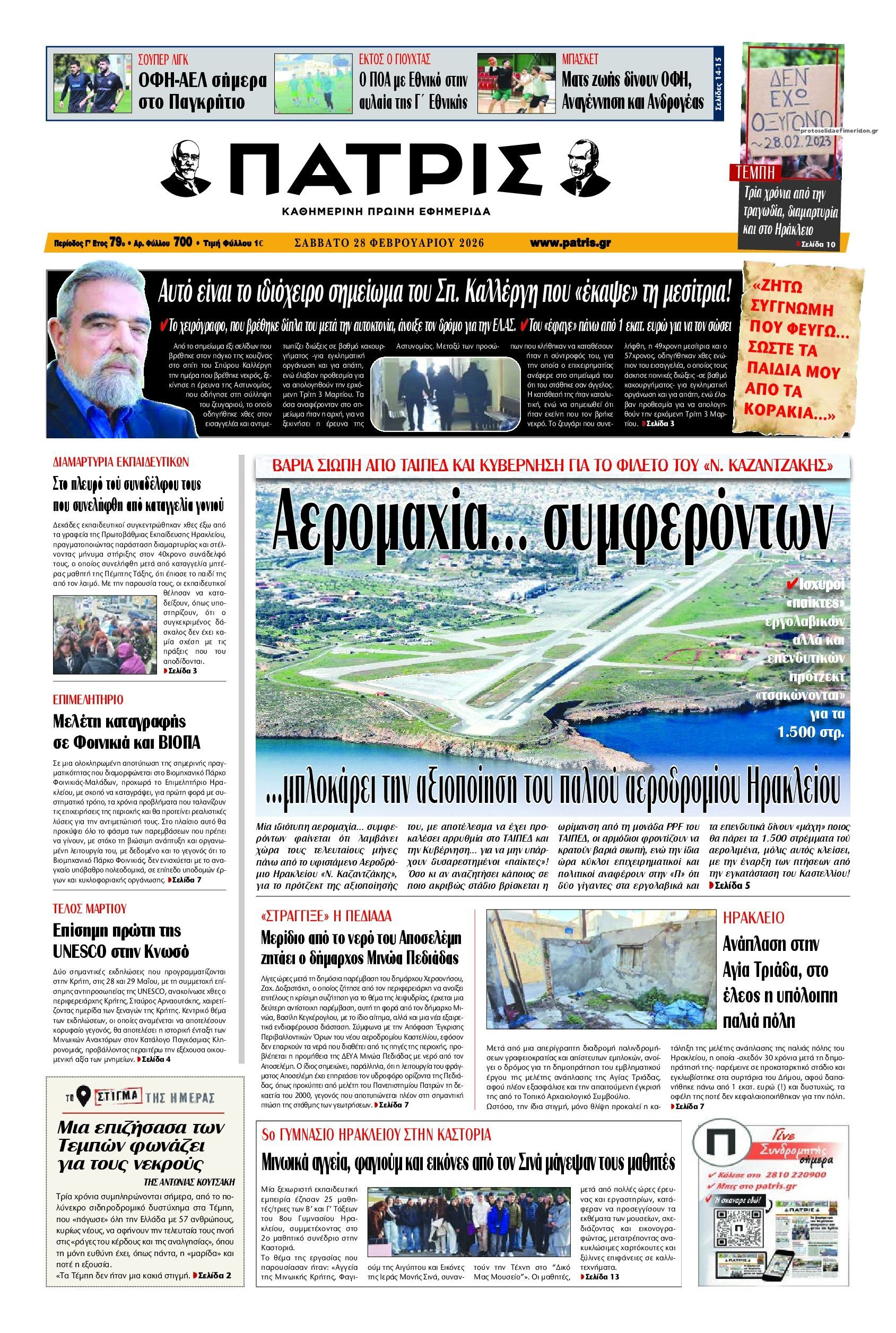 Αίσθηση προκάλεσε στην τοπική κοινωνία το πρωτοσέλιδο της εφημερίδας «Πατρίς», σχετικά με τη σιωπή ΤΑΙΠΕΔ και Κυβέρνησης και τη σύγκρουση των συμφερόντων μεγάλων εργολαβικών και επενδυτικών πρότζεκτ για την αξιοποίηση του φιλέτου των 1.500 στρεμμάτων στη σημερινή εγκατάσταση του Αεροδρομίου Ηρακλείου «Ν. Καζαντζάκης».