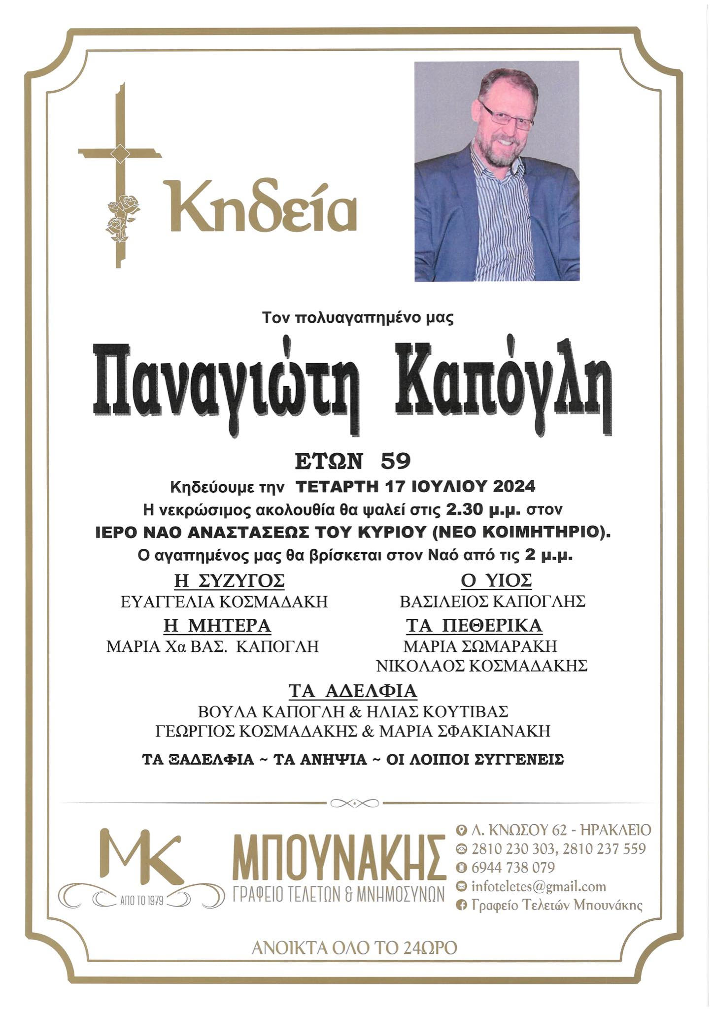 Μετά από αγώνα 2 χρόνων, έφυγε από την ζωή σε ηλικία 59 ετών ο Παναγιώτης Καπόγλης γνωστός ιδιοκτήτης γυμναστηρίου.