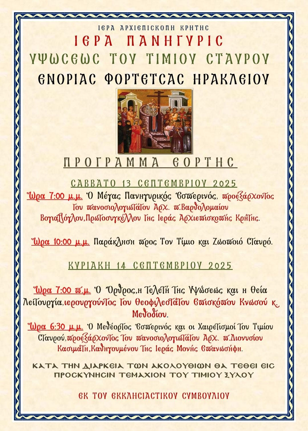 Το Σάββατο 13 Σεπτεμβρίου, στις 7:00 μ.μ., θα τελεστεί ο Μέγας Πανηγυρικός Εσπερινός, χοροστατούντος του πανοσιολογιωτάτου Αρχιμανδρίτη Βαρθολομαίου Βογιατζόγλου, πρωτοσυγκέλλου της Ιεράς Αρχιεπισκοπής Κρήτης.