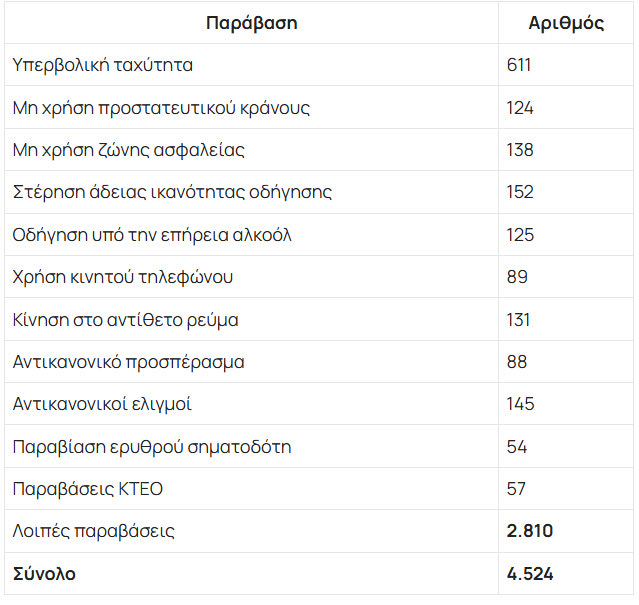 Οι πιο συχνές αφορούσαν υπερβολική ταχύτητα (611), μη χρήση ζώνης (138) και οδήγηση χωρίς δίπλωμα (152). Τα μέτρα εφαρμόστηκαν σε ολόκληρο το οδικό δίκτυο του νησιού, στο πλαίσιο πρόληψης τροχαίων ατυχημάτων.