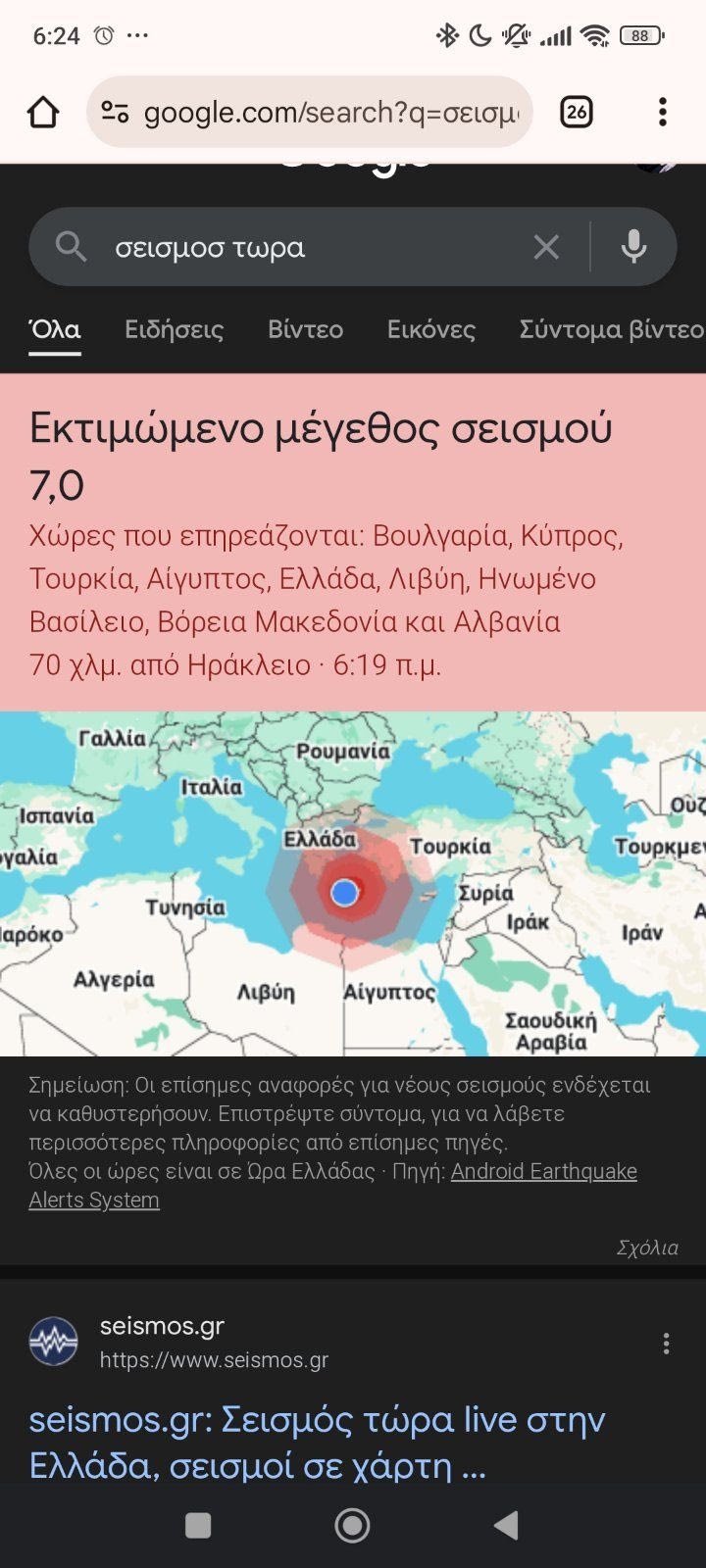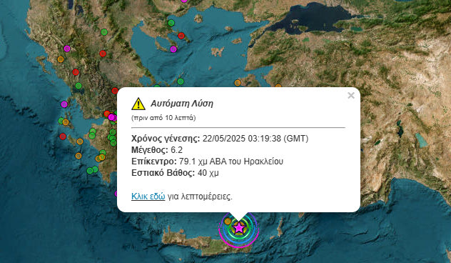 Η πρώτη εκτίμηση που έστειλε το αυτόματο σύστημα έδωσε εκτιμώμενο μέγεθος στα 7 Ρίχτερ με απόσταση περίπου 70 χιλιόμετρα από το Ηράκλειο, όπως βλέπουμε στην παρακάτω εικόνα.