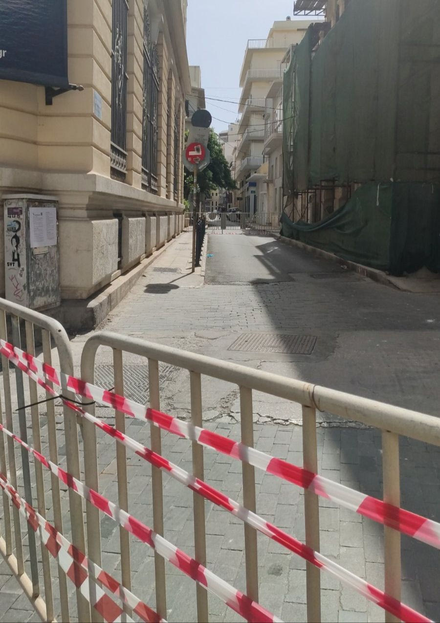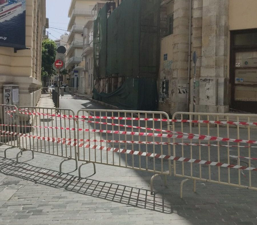 Κλειστή παραμένει για πεζούς και οδηγούς η οδός Επιμενίδου για λόγους ασφαλείας, μετά την πτώση κομματιών από την πρόσοψη του Μεγάρου Κοθρή-Λιοπυράκη, απόρροια του ισχυρού σεισμού που σημειώθηκε νωρίς το πρωί της Πέμπτης (22/05).
