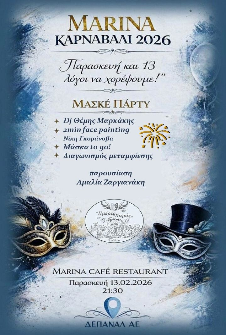 Έτσι την Παρασκευή 13 Φεβρουαρίου, στις 21:00 στο Μαρίνα Cafe’ Restaurant, θα πραγματοποιηθεί το μεγάλο μασκέ πάρτι ενώ dj θα είναι ο Θέμης Μαρκάκης που με αποκριάτικες μουσικές θα τους παρασύρει όλους στους ρυθμούς του βασιλιά Καρνάβαλου! Παράλληλα θα γίνει ένας μεγάλος διαγωνισμός για μεταμφιεσμένους με πολλές εκπλήξεις, μάσκες to go ενώ η Νίκη Γκοράνοβα θα κάνει 2min face painting.