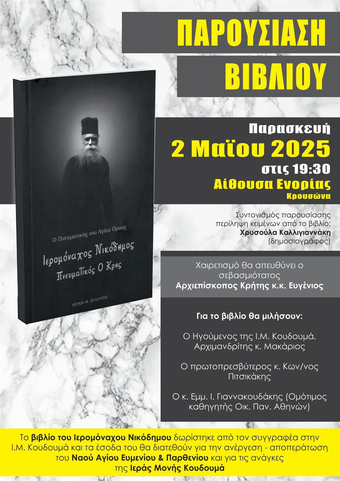 Ο Μύρων Μ. Ξυλούρης με μεγάλη χαρά προσκαλεί το κοινό στην παρουσίαση του νέου του βιβλίου, με τίτλο «Ο Πνευματικός του Αγίου Όρους – Ιερομόναχος Νικόδημος Πνευματικός ο Κρης», που θα πραγματοποιηθεί την Παρασκευή 2 Μαίου 2025 στις 7.30μμ, στην αίθουσα της Ενορίας Κρουσώνα.