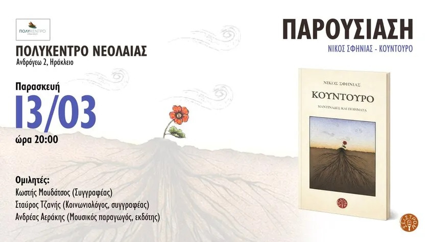 Ο εκδοτικός οίκος «ΣΕΙΣΤΡΟΝ» σας προσκαλούν την Παρασκευή, 13 Μαρτίου στις 20:00, στο Πολύκεντρο Δήμου Ηρακλείου (Ανδρόγεω 2), στην παρουσίαση του βιβλίου «ΚΟΥΝΤΟΥΡΟ» του Νίκου Σφηνιά.