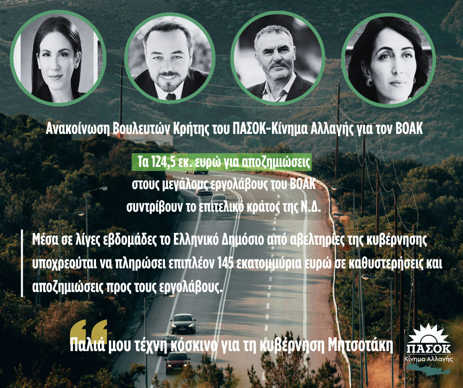 Το ΠΑΣΟΚ – Κίνημα Αλλαγής θα συνεχίσει να αναδεικνύει με υπευθυνότητα τις πραγματικές αιτίες των καθυστερήσεων, να διεκδικεί διαφάνεια και πραγματική πρόοδο στα μεγάλα έργα υποδομής της Κρήτης, γιατί ο ΒΟΑΚ δεν μπορεί να είναι πεδίο σκοπιμοτήτων και αδιαφάνειας, αλλά εργαλείο ανάπτυξης και ασφάλειας για όλους τους πολίτες”.