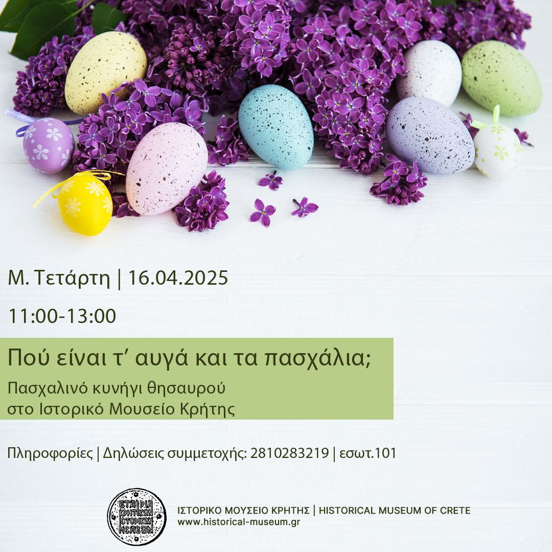 Με αφορμή το Πάσχα το τμήμα Εκπαιδευτικών Προγραμμάτων του ΙΜΚ προσκαλεί παιδιά και ενήλικες σε ένα πρωινό γεμάτο παιχνίδι στο Μουσείο. Θα επιχειρήσουμε να ρίξουμε φως στην ιστορία του Ηρακλείου και να αναζητήσουμε πασχαλινά έθιμα και ανοιξιάτικες εικόνες στις εκθέσεις του Μουσείου.