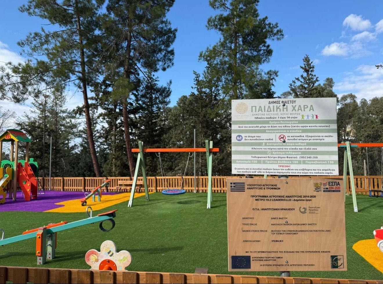 Ο Δήμος Φαιστού ανακοινώνει την ολοκλήρωση και παράδοση προς χρήση των πέντε νέων, αναβαθμισμένων και πλήρως πιστοποιημένων παιδικών χαρών, στο πλαίσιο του έργου «Ανάπλαση παιδικών χαρών του Δήμου Φαιστού», το οποίο χρηματοδοτήθηκε από το πρόγραμμα «Αγροτική Ανάπτυξη της Ελλάδας– CLLD LEADER», με συγχρηματοδότηση από το ΕΓΤΑΑ .